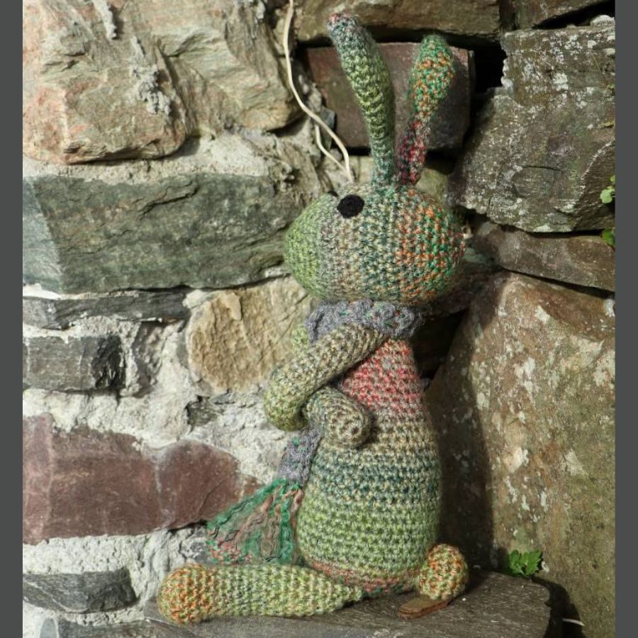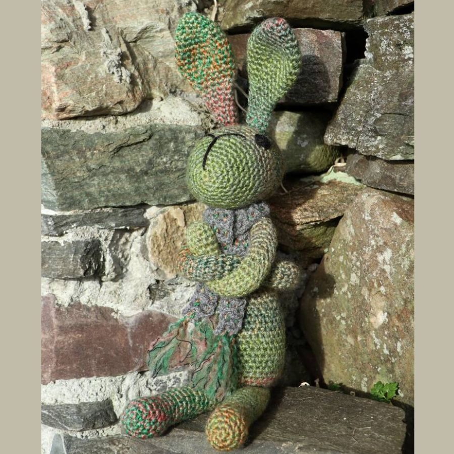 Teigue is crochet in a lovely variegated green acrylic yarn, has crochet black eyes and wears a long scarf. Each bunny is unique in name as well as colours. Teigue is 47cm tall and can sit upright by himself.