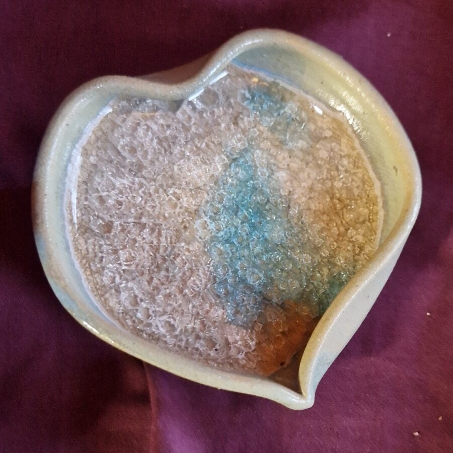 A turquoise heart shaped dish with melted glass crackle effect. Hand thrown on the wheel. Not food safe, dishwasher or microwave safe.