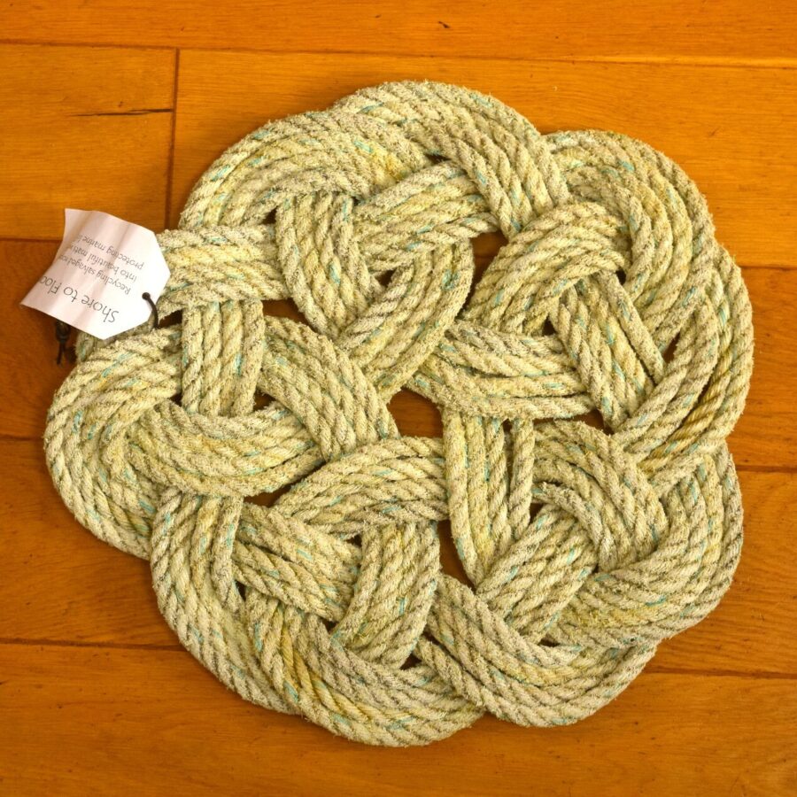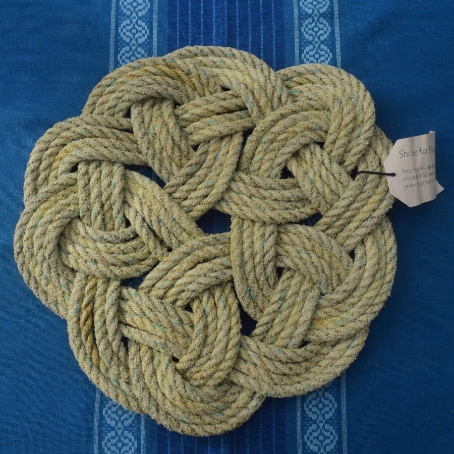 A kringle design mat hand-made from reclaimed rope salvaged from Caroy Beach, Isle of Skye. Pale turquoise with turquoise fleck. Suitable as a table mat or small door mat.