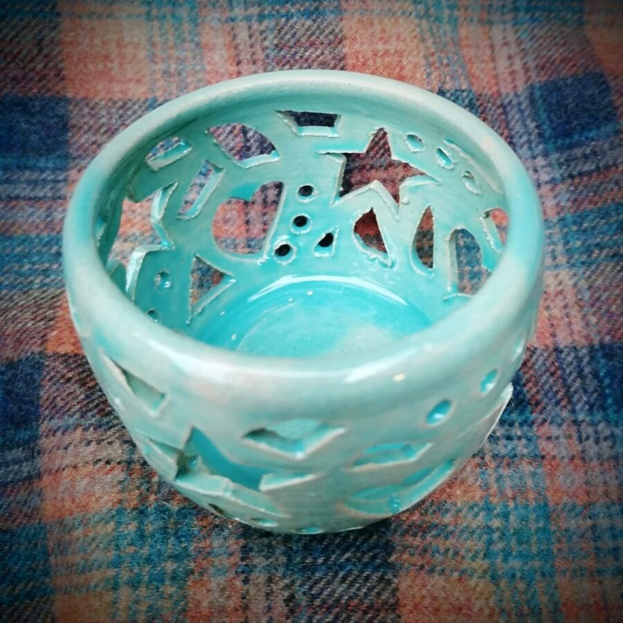 A small stoneware tealight holder in turquoise. Hand thrown on the wheel, cut out by hand. Dishwasher and microwave safe.