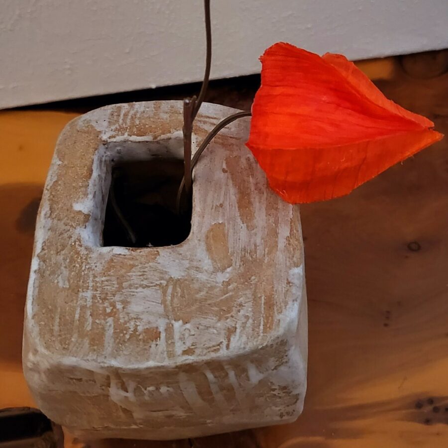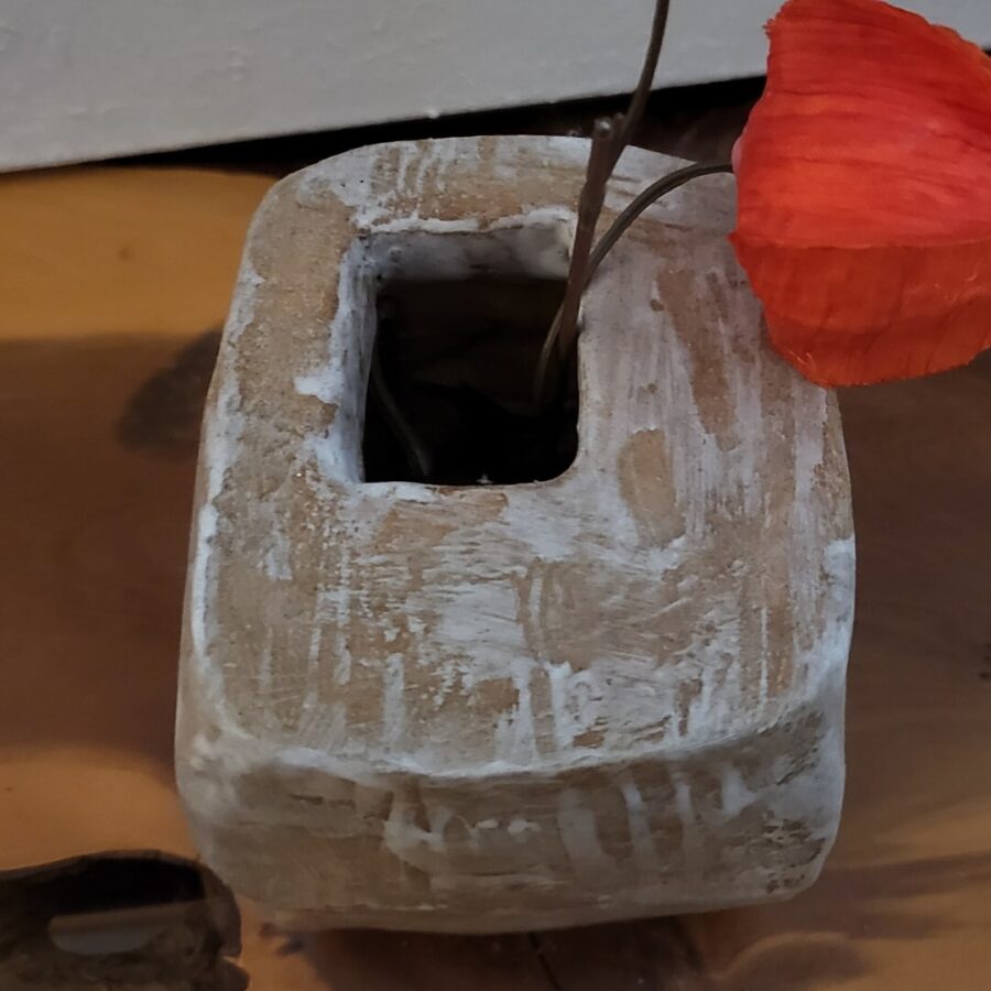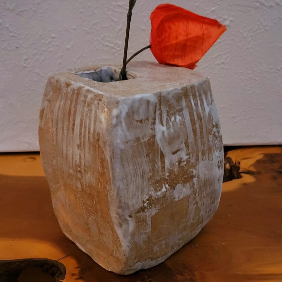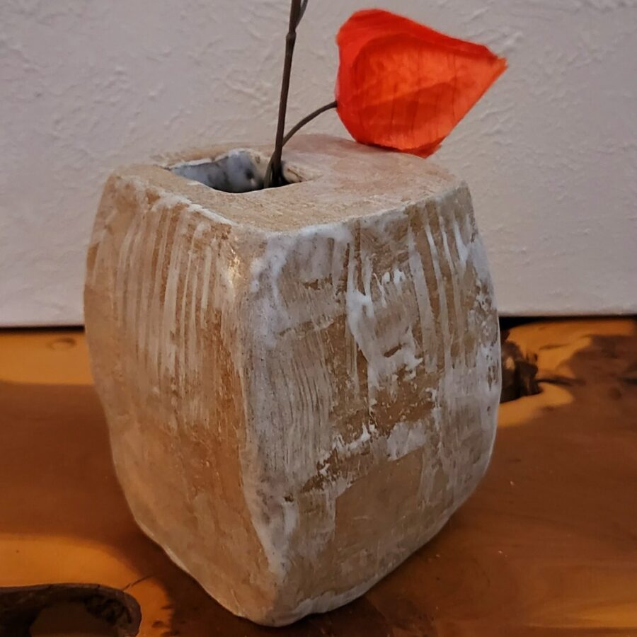A delightful small Wabi Sabi vessel in toasted stone with a white matt glaze wash.