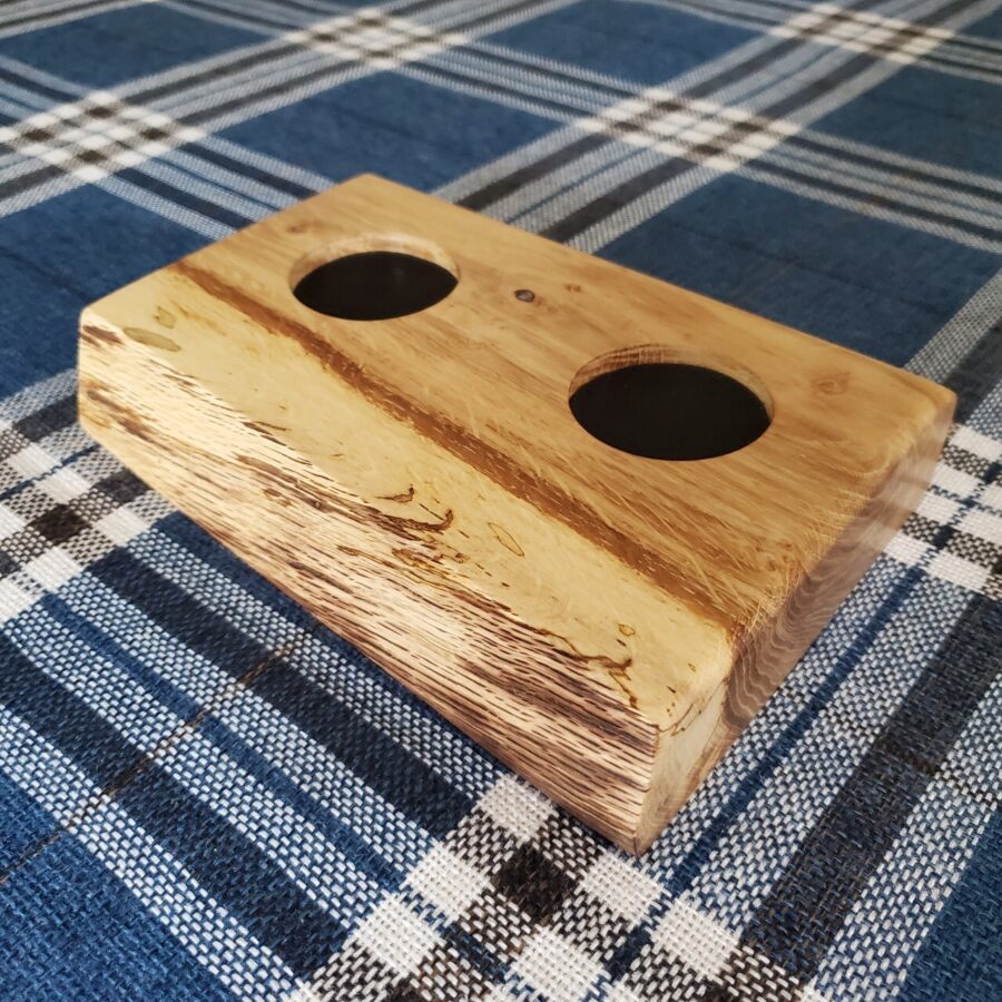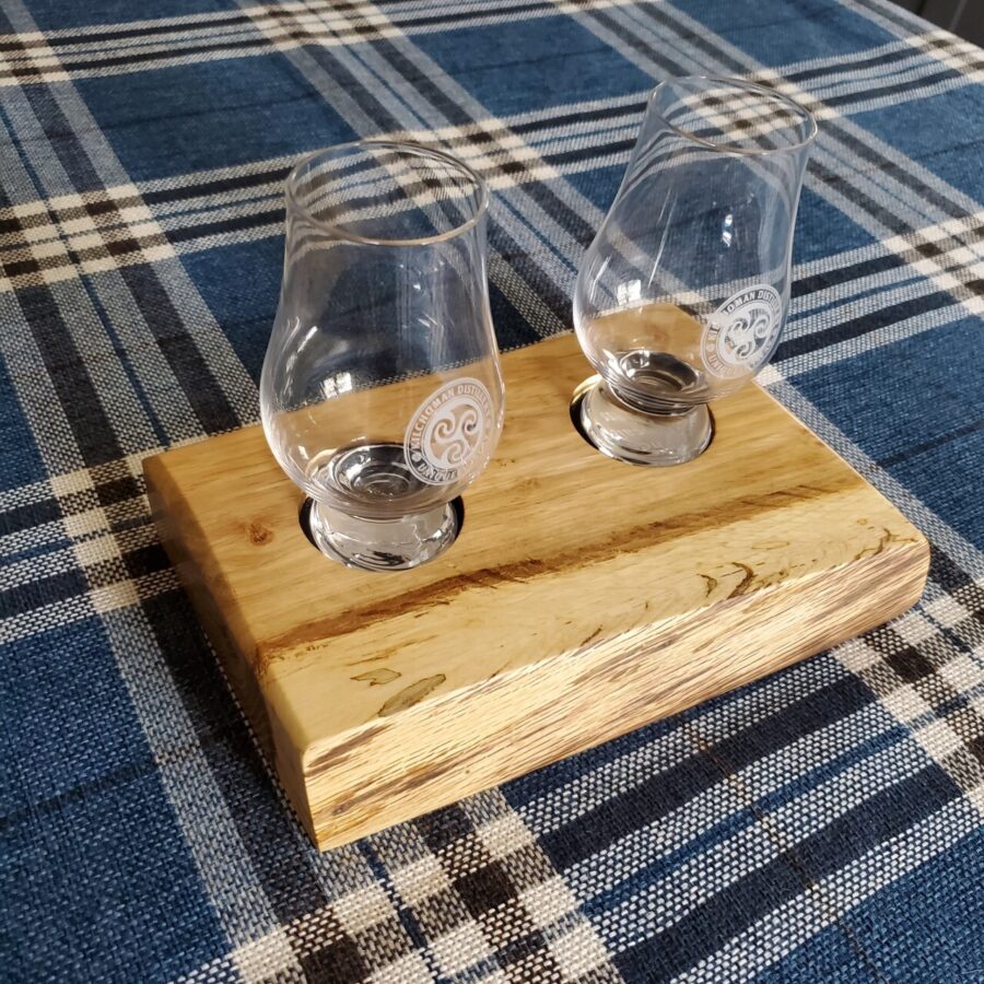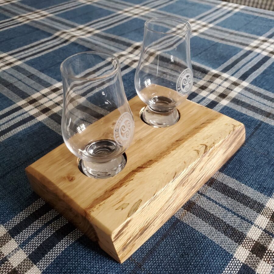 This beautiful whisky tasting board is made from oak. It has 2 recesses suitable for the classic Glencairn whisky glass. Removable leather discs in recesses. Glasses not included.