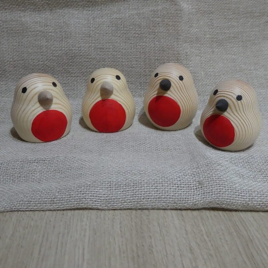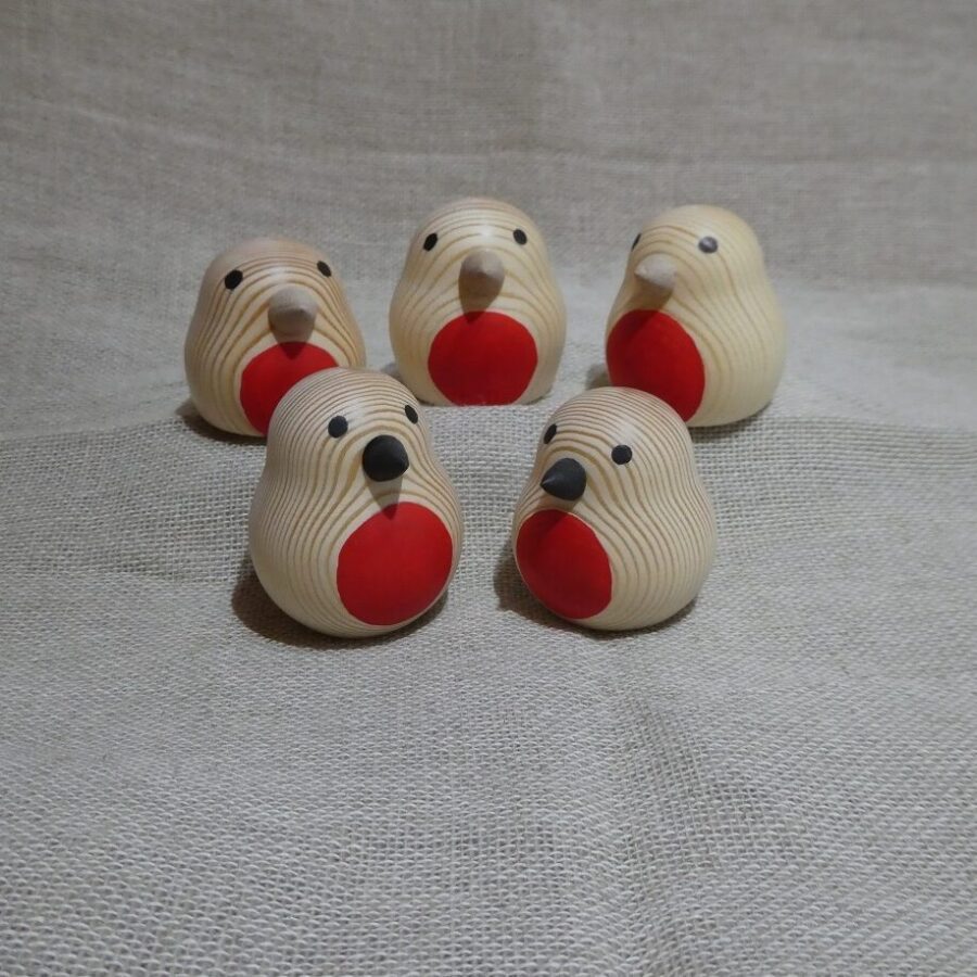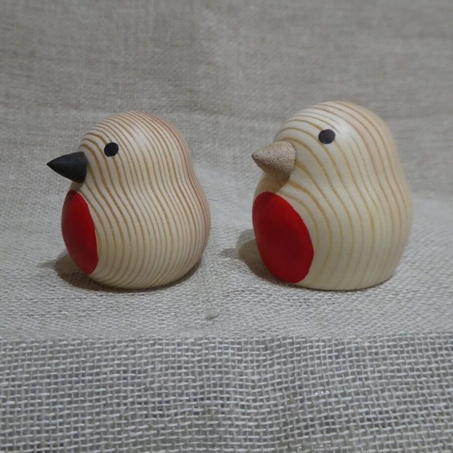 These robins are a seasonal variation of the cheeky birds, hand-turned from pine wood and finished with wax and acrylic paint. Each robin has a slightly different character and expression due to variations in the wood and the hand turning and crafting process. No apology is made for blemishes and markings in the wood - these all add to its character. Images are for illustration as these birds are generally made to order. Can be bought as single bird, as a pair, or even a small flock! NOTE: These birds are ornaments NOT TOYS.