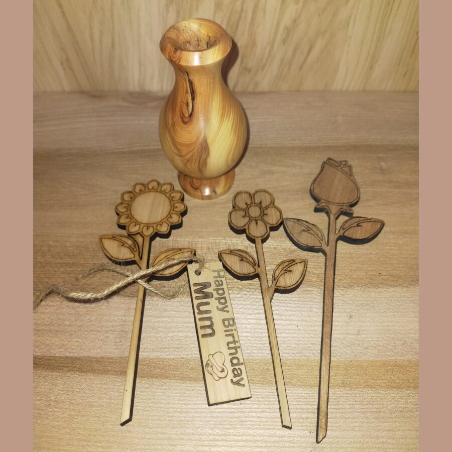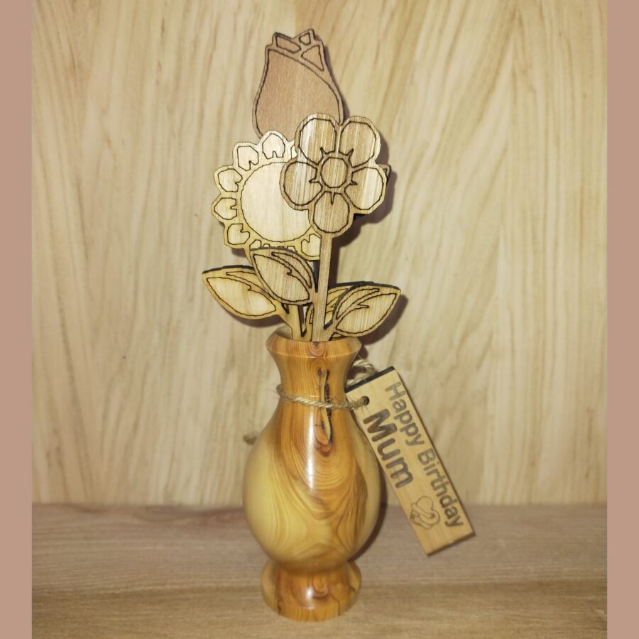A bouquet of three pretty wooden flowers made out of hardwood complete with yew vase. Add your wording for the tag (both sides) using the comment box on ordering.
