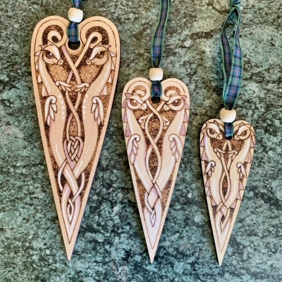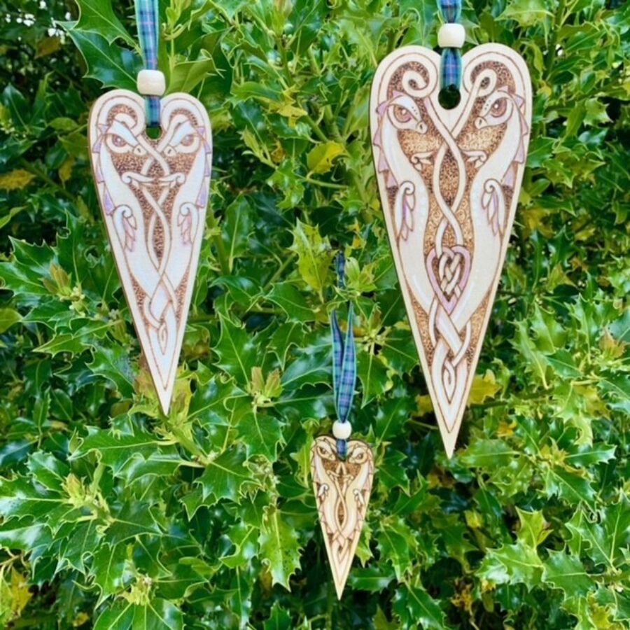 Each heart is fire drawn using a pyrography pen, then highlighted with acrylic and coloured pencil then sealed with a matt varnish. Embellished with a tartan ribbon and a wooden bead. Each heart is signed for authenticity as each one is unique.