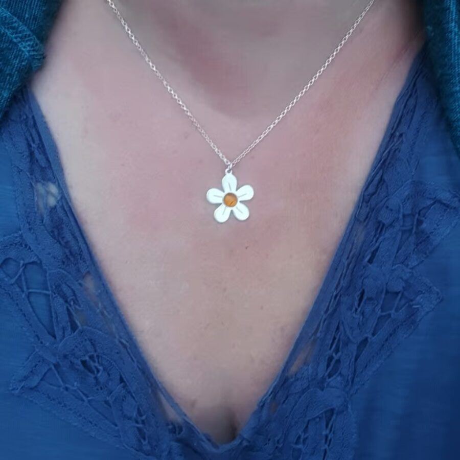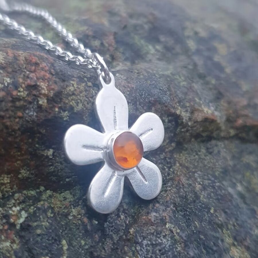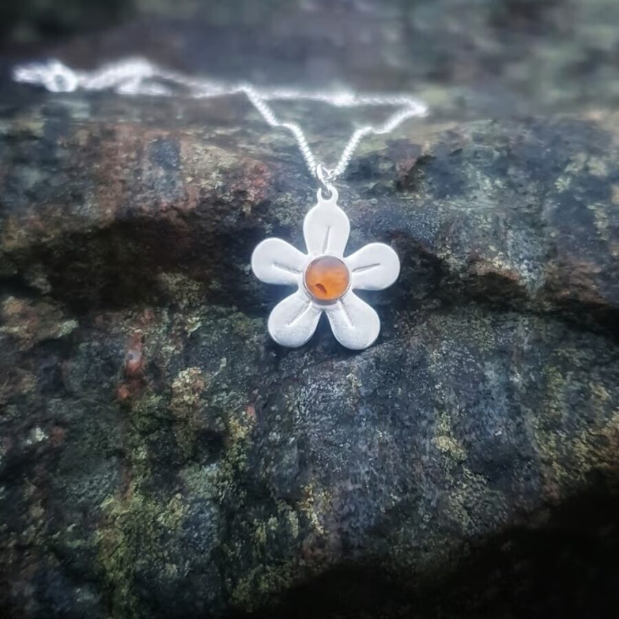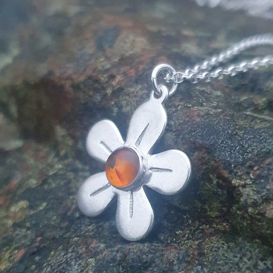 This beautiful necklace features a stunning 8mm baltic amber gemstone in a sterling silver flower. This item comes gift boxed and is sent special delivery.