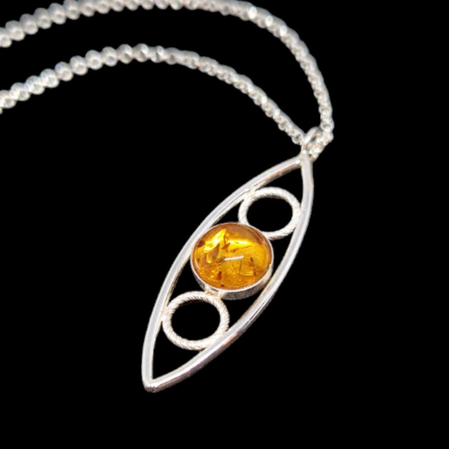 A beautiful pendant featuring an amber set in silver circles. All items are gift boxed with recyclable packaging.