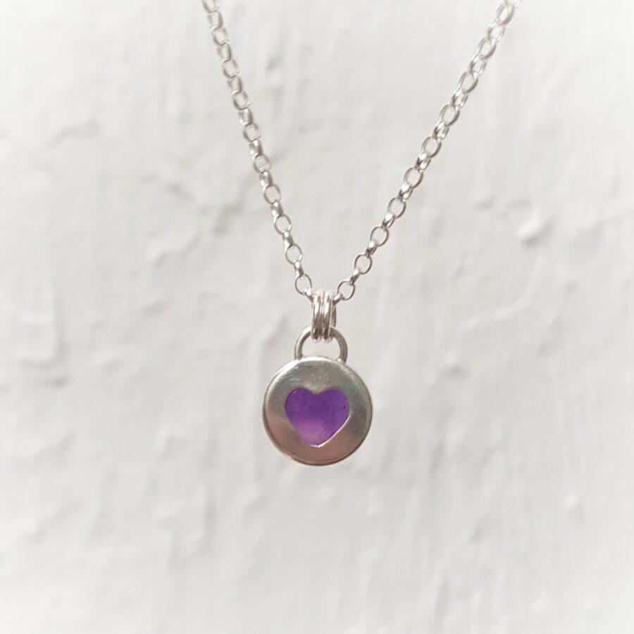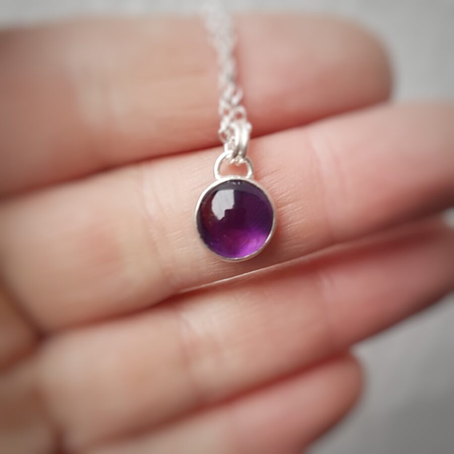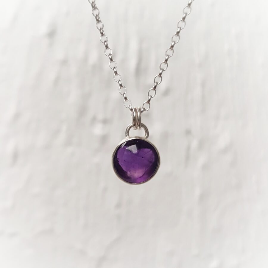 This beautiful necklace has a top quality rich deep purple coloured Amethyst encased in sterling silver, with a wee heart cut out the back. Hangs from an 18 inch chain. Amethyst is the birthstone for February This necklace will come gift boxed.