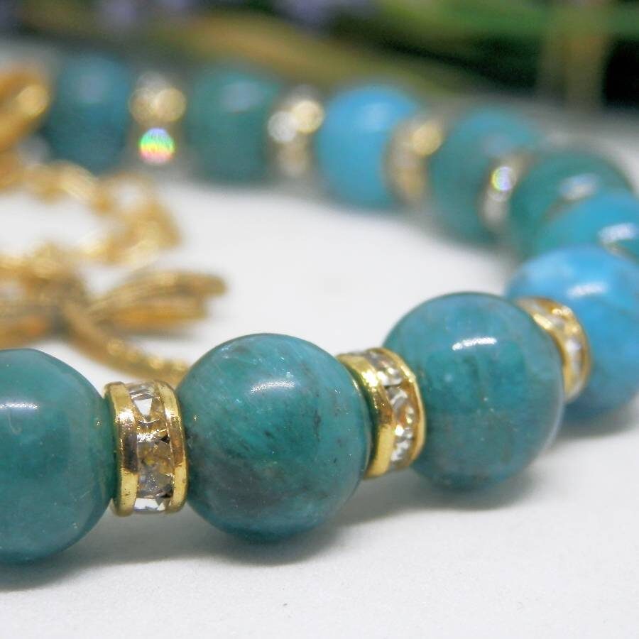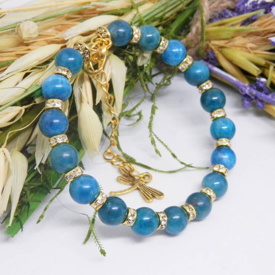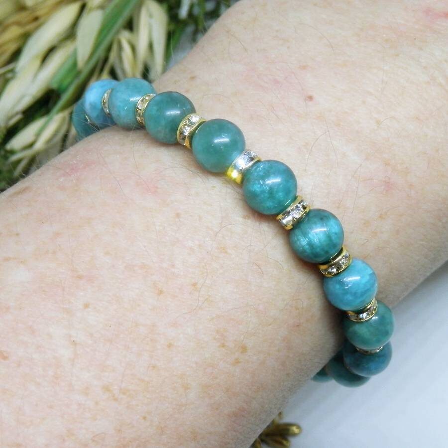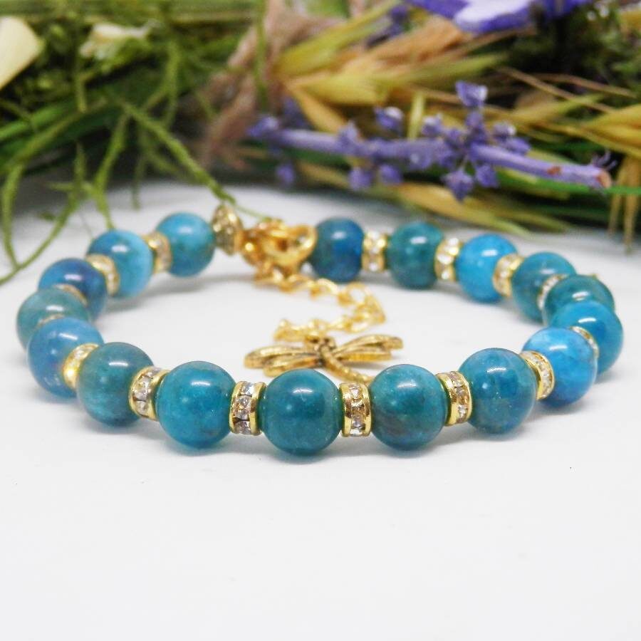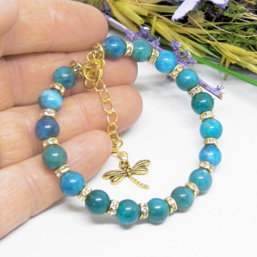 A stunning memory wire bracelet made using gold plated wire, with blue-green apatite beads and sparkly diamante spacers. Nickle and Lead Free. Would fit up to a 7 inch wrist, but has an extension chain for larger sized wrists. Comes to you wrapped in tissue, no plastic. Posted in repurposed envelopes or boxes – trying to do my tiny bit for the environment by reusing my postage wrappings.