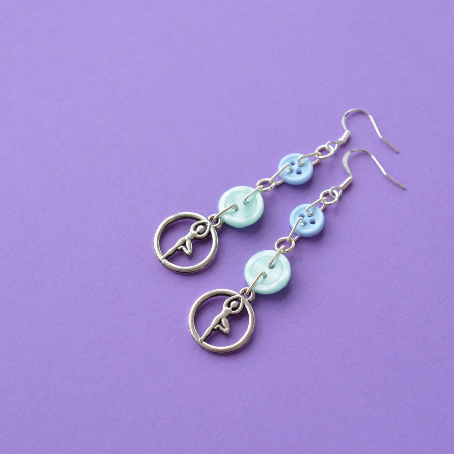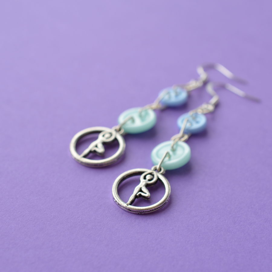 These earrings have two aqua blue buttons with a yoga tree pose charm hanging at the bottom. The ear findings are sterling silver, other findings are silver-plated. The full length of earring from the top of the hook is approx. 7cm. Supplied in a gift pouch.