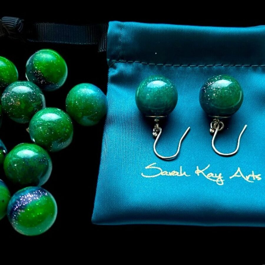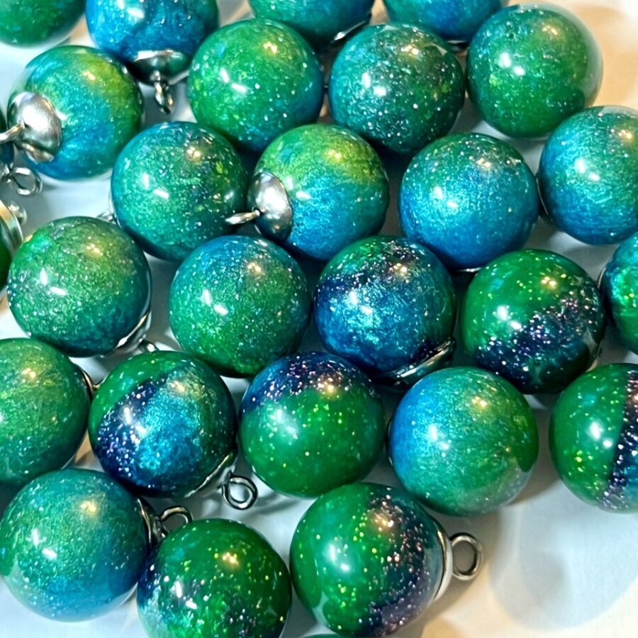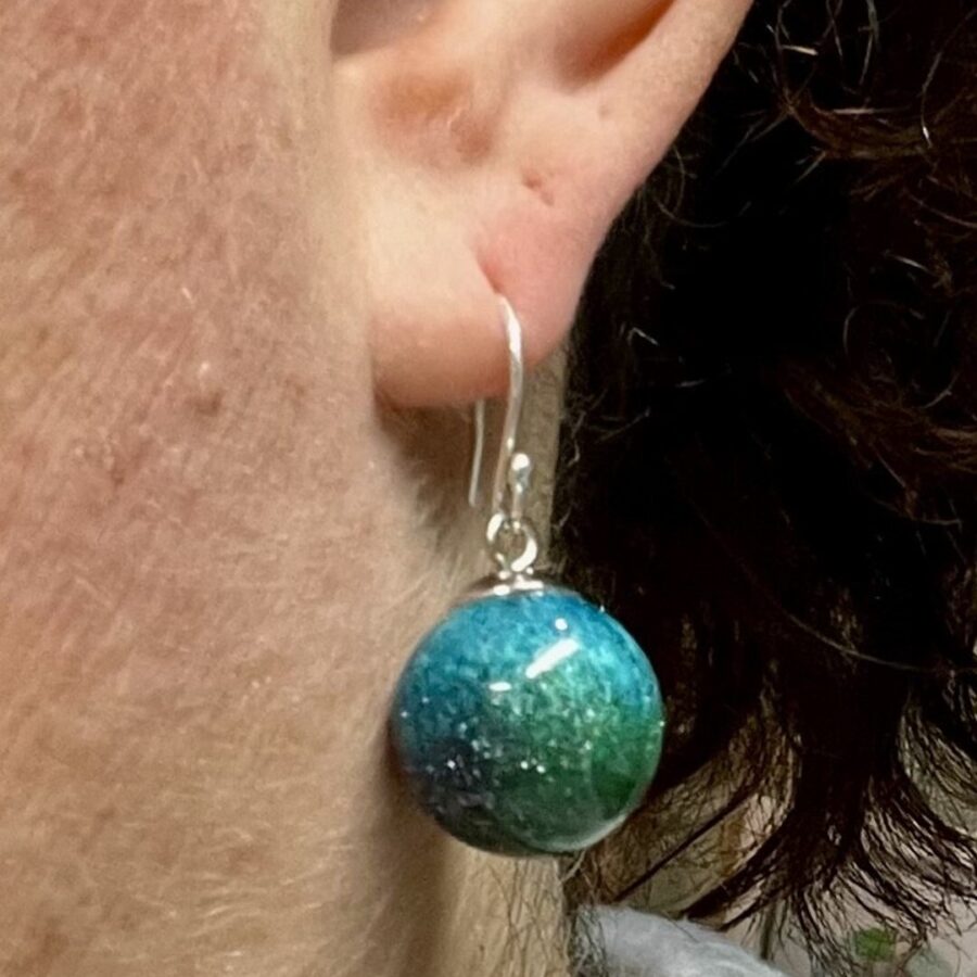 Aurora borealis (or Mirrie dancers as it's called in Shetland) inspires this jewellery collection. These dangly ball earrings are made using epoxy resin, coloured with touches of blues and purples through the glow in the dark greens, metallic pigments, sparkle and imagination. The ear wire is hallmarked sterling silver. They are available in 2 sizes - small measuring 10 mm across and large measuring 14 mm across. These earrings come in a velvet gift bag. Select your preferred size using the drop down menu on ordering.