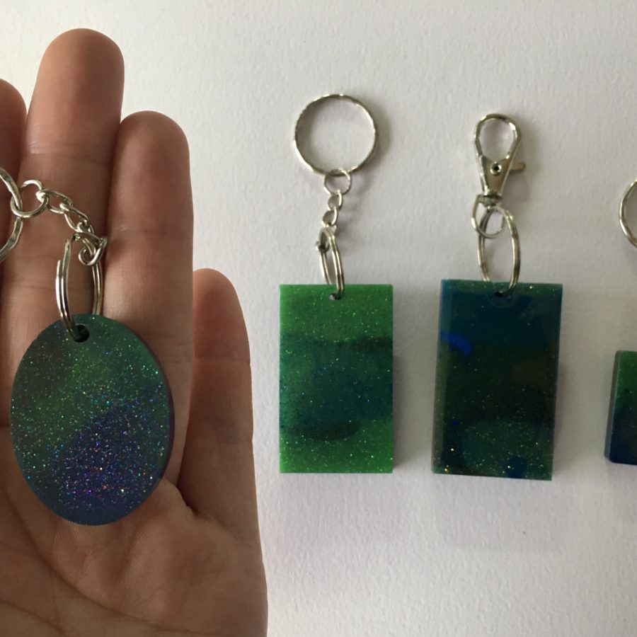 Aurora Borealis inspired keyring. Each one is original, handmade using resin, metallic, glow in the dark green and imagination. Choose your size (rectangle oval or square) and from a clip ring or keyring. Rectangles - 5 x 3 cm. Oval - 4 x 3 cm. Square - 3 x 3 cm. The keyring comes in blue organza gift pouch