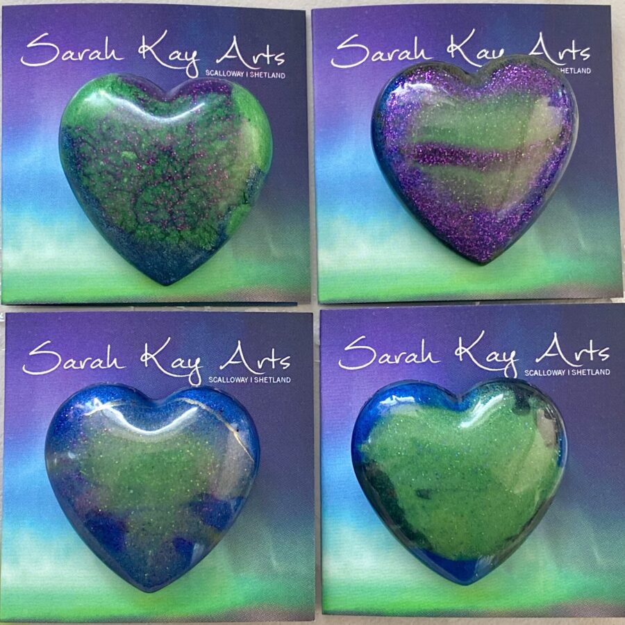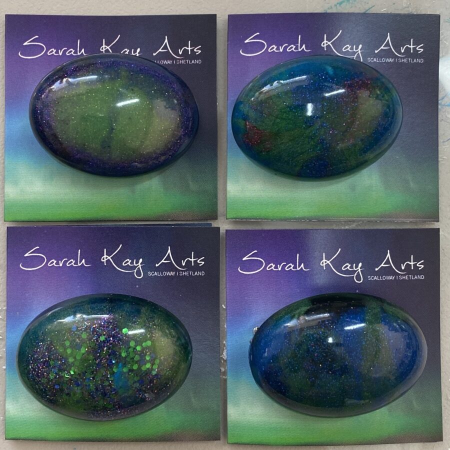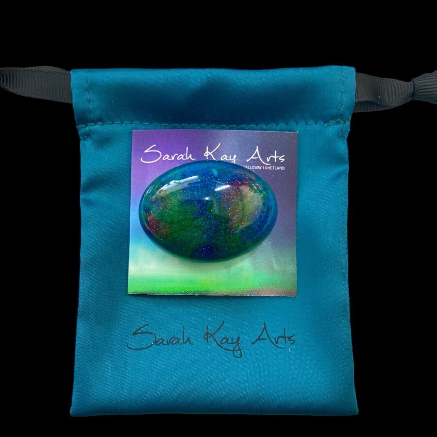 Aurora inspired brooch (large) with choice of shape - square, oval, circle or heart. Each piece is handcrafted from highest quality resin, mixed with metalic pigments, coloured with touches of blues and purples through the glow in the dark greens, sparkle and imagination. Made in Sarah's Shetland studio. They have a steel brooch bar on the back. Each brooch comes attached to a card inside a navy velvet gift pouch. Select your choice of shape using the drop down menu on ordering.