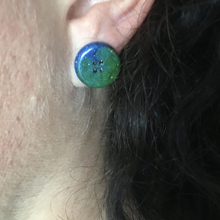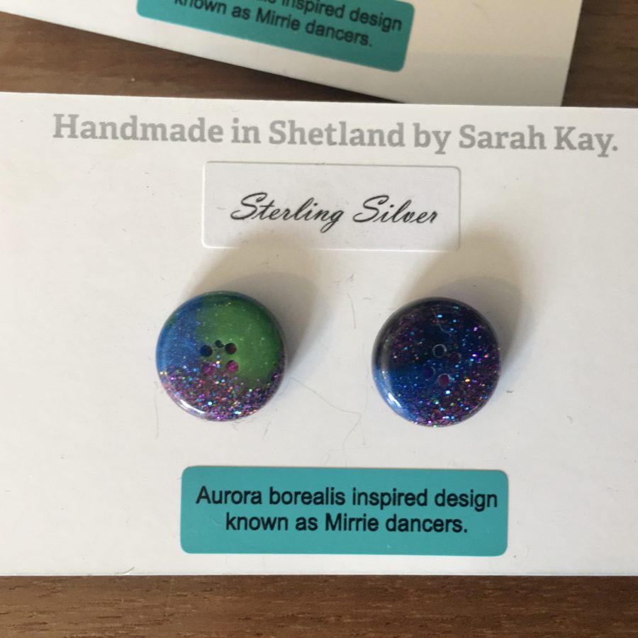 Aurora borealis (or Mirrie dancers as it's called in Shetland) inspires this jewellery collection as well as our islands knitting heritage. There are 3 designs of aurora button earrings made using epoxy resin and coloured with touches of blues and purples through the glow in the dark greens, metallic pigments, sparkle and imagination. The ear wire is hallmarked sterling silver as is the post and butterfly on the studs. The base of the dangly pair is steel. Please choose your favourite style from the drop down - dangly button, mini stud (10 mm) or larger stud design (14 mm). These earrings come in a velvet gift bag.
