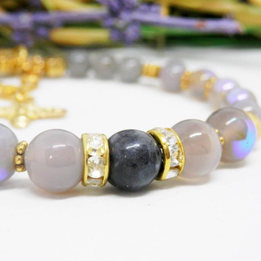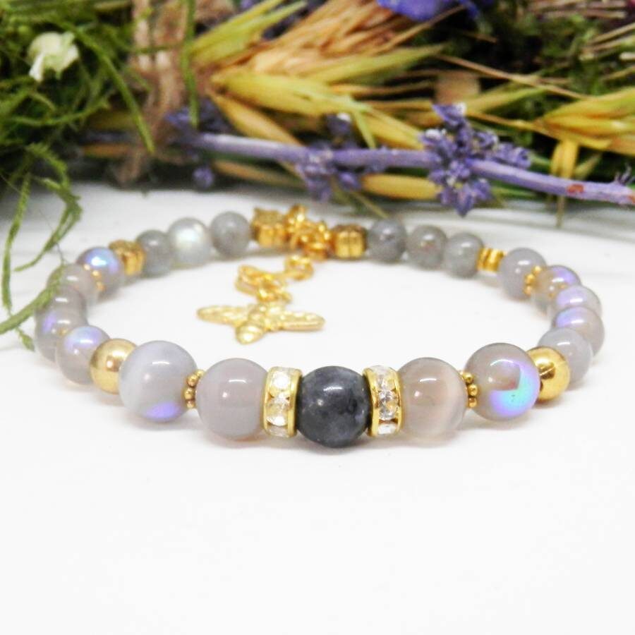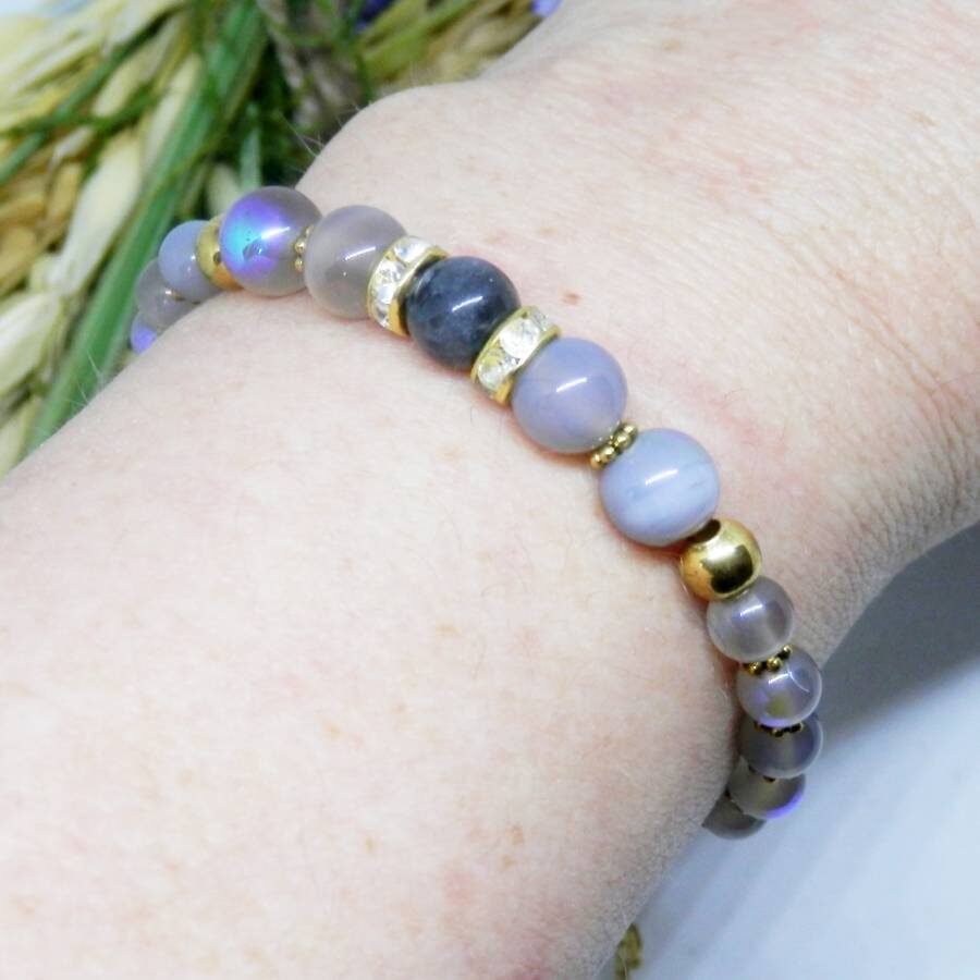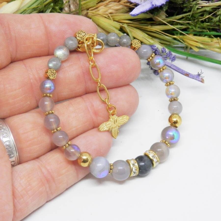 This lovely memory wire bracelet is made using gold plated memory wire, gold toned Celtic patterned beads diamante spacers and gorgeous aurora coated labradorite beads and a focal dark coloured larvikite bead. Comes with a cute gold plated bee charm. Nickle and Lead Free. Would fit up to a 6.5 inch wrist, with an extension chain for larger sizes. Comes to you wrapped in tissue, no plastic. Posted in repurposed envelopes or boxes as the maker is trying to do her tiny bit for the environment by reusing my postage wrappings.