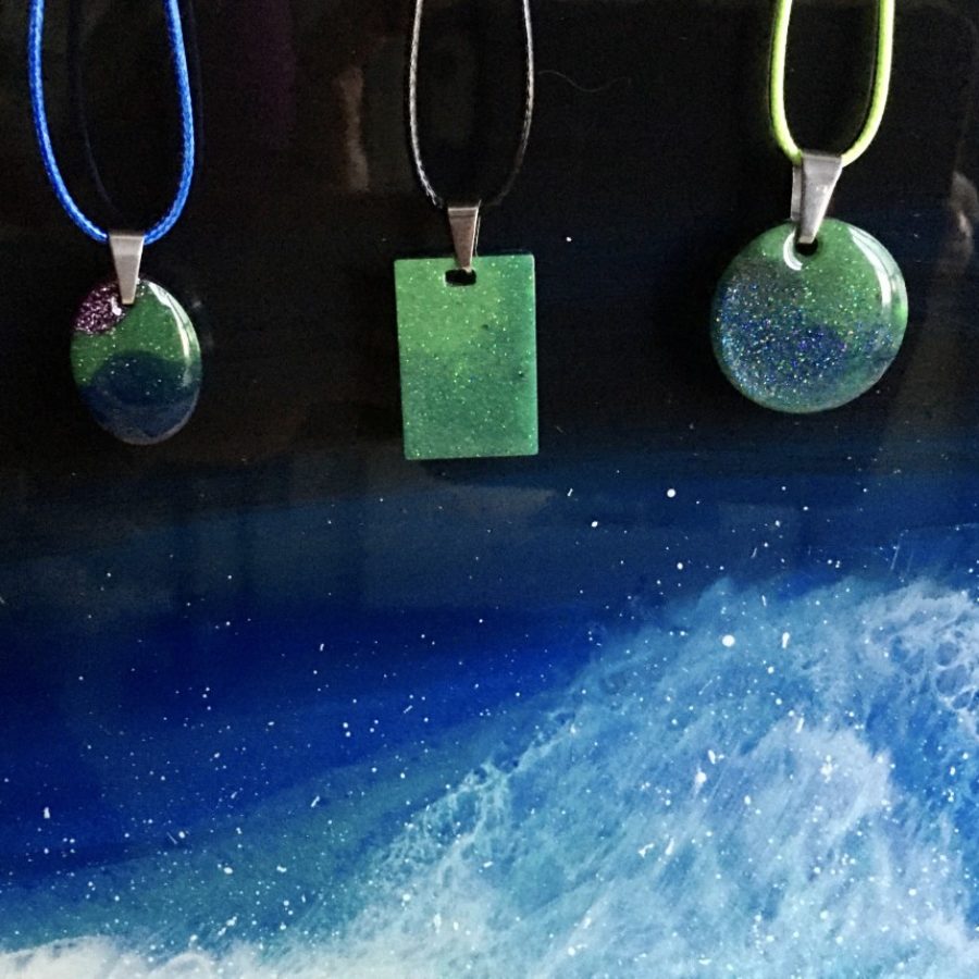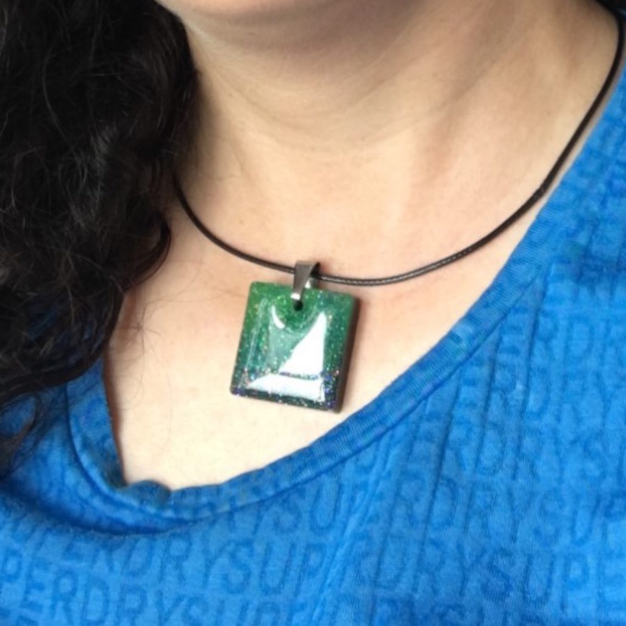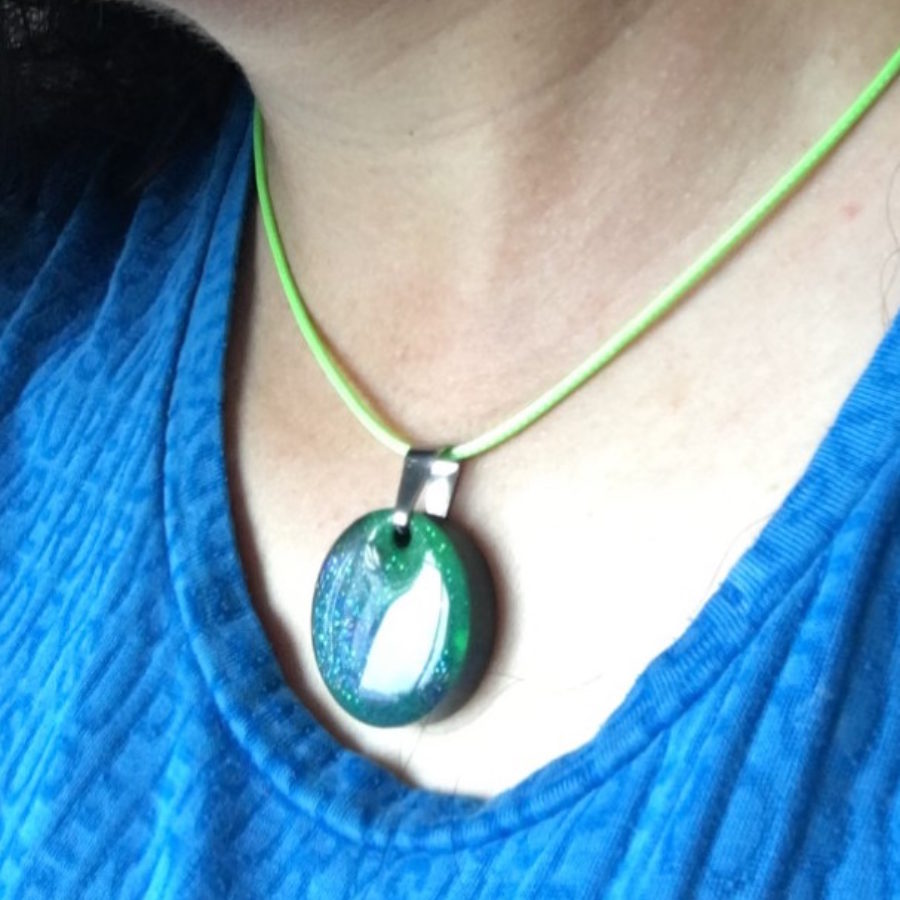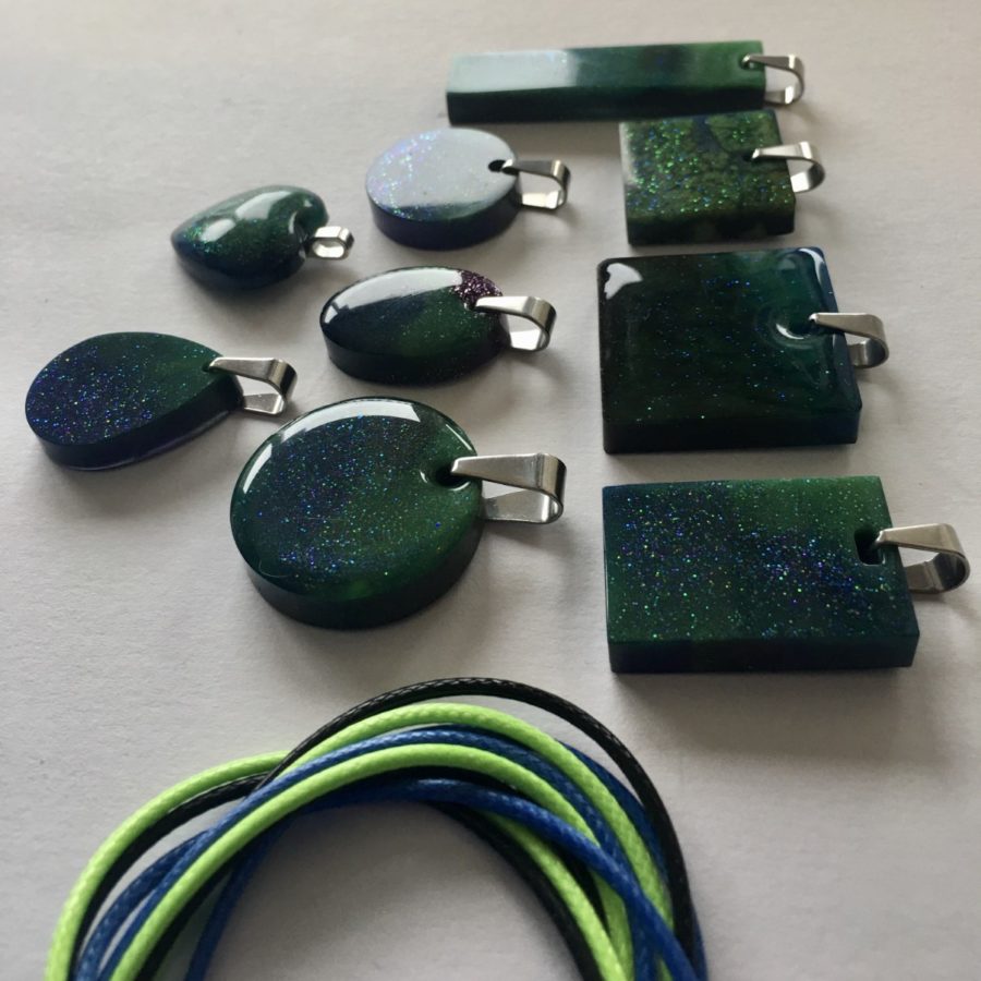 Aurora Borealis inspired pendants with coloured cord. The beautiful night skies on the Shetland islands inspired this jewellery collection, incorporating glow in the dark green. The pendant comes in a velvet bag. Choose from oval, tear drop, long rectangle, rectangle, square 3 cm, square 2.5 cm, circle 3 cm, circle 2.5 cm or heart shaped, and choose your colour of cord; black, blue or neon green. Add your choices in the comment box on ordering.
