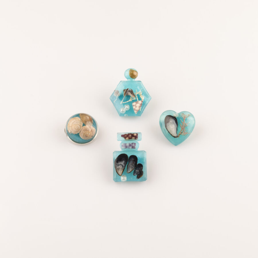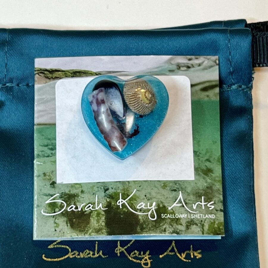 These sea blue beach brooches are made from the tiny shells, seaweed and other treasures Sarah finds on the beaches on Shetland. Each brooch is slightly different and original. The brooches are made with mica powders to colour the background which shimmer in the light.