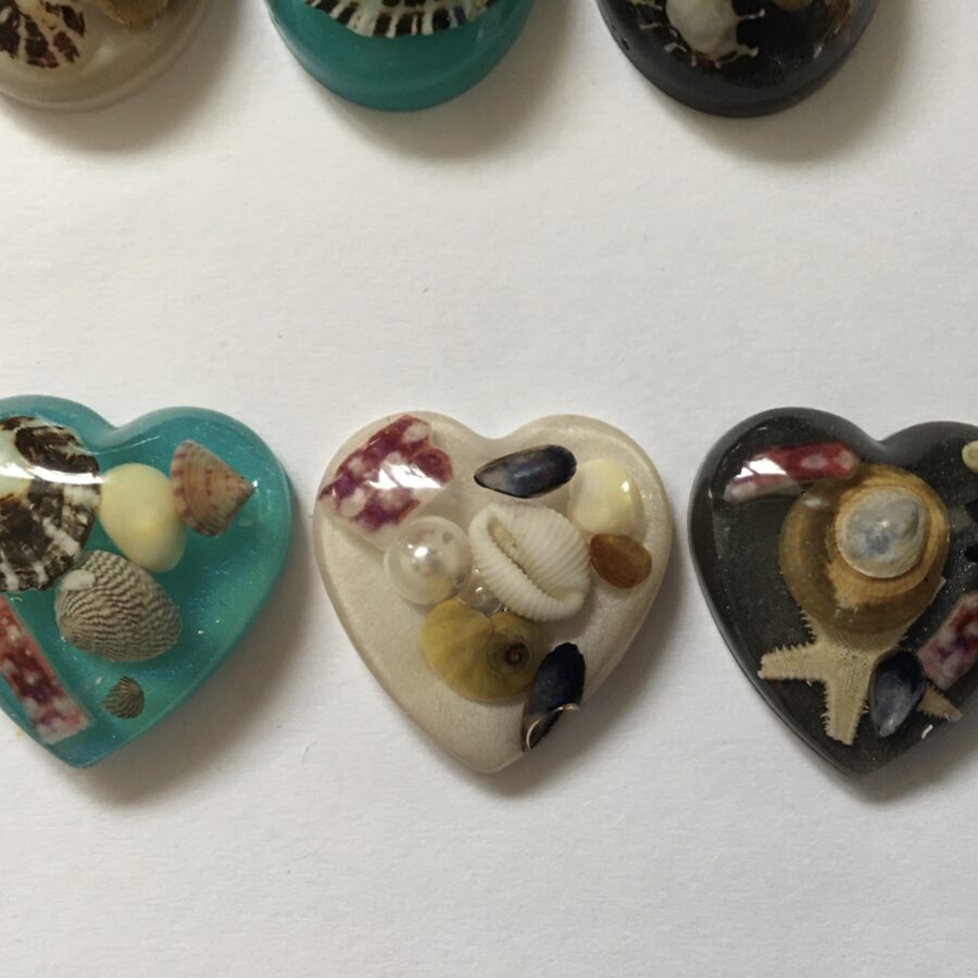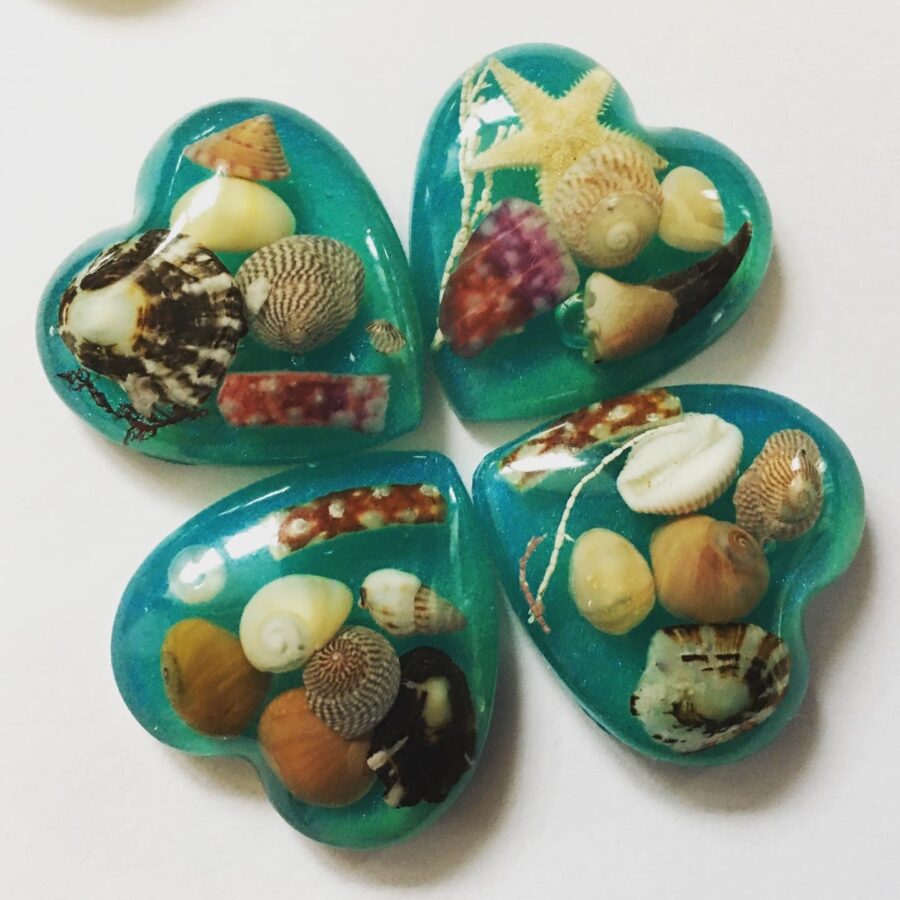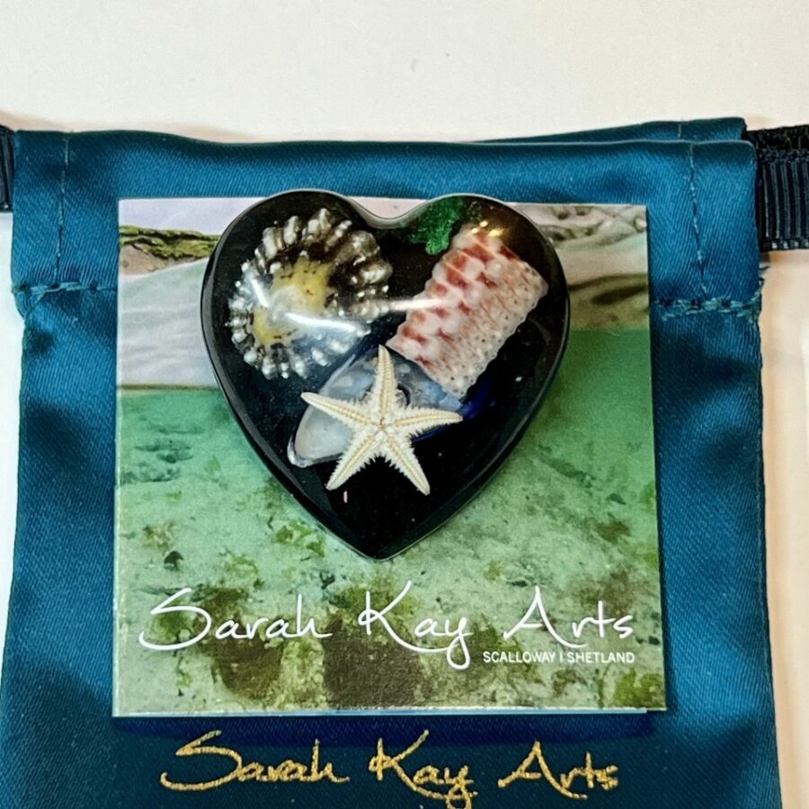 These brooches are made from the tiny shells, seaweed and other treasures Sarah finds on the beaches on Shetland. Each brooch is slightly different and original. The brooches are made with mica powders to colour the background which shimmer in the light. Please choose your favourite from shimmering black, sea blue or white.