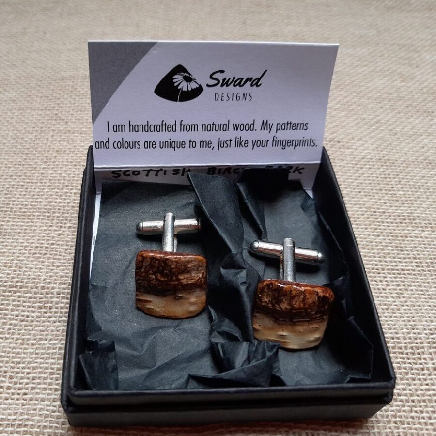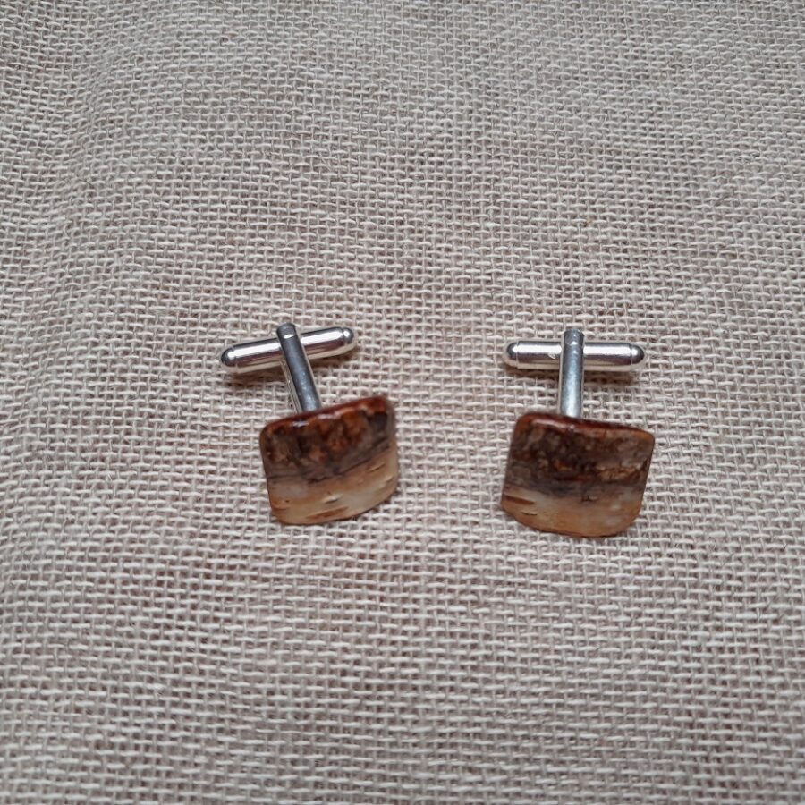 A pair of birch bark cufflinks on silver coloured plated metal. These cufflinks are handcrafted from natural Scottish birch bark, mounted on silver coloured plated metal. Each piece has been individually hand cut then finished with a clear toy-safe lacquer. This type of finish enhances the fantastic range of colours and patterns found in natural wood. Each piece of wood has its own individual fingerprint, so each cufflink will be truly unique.