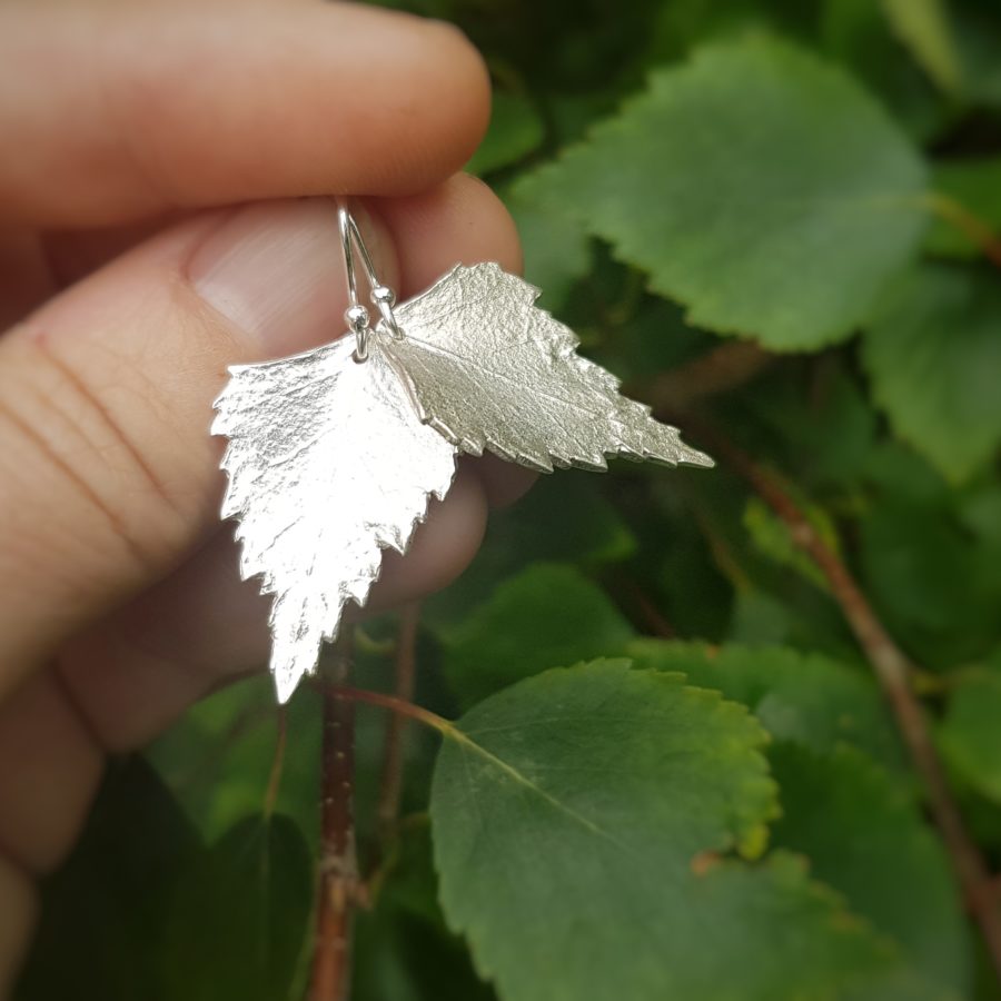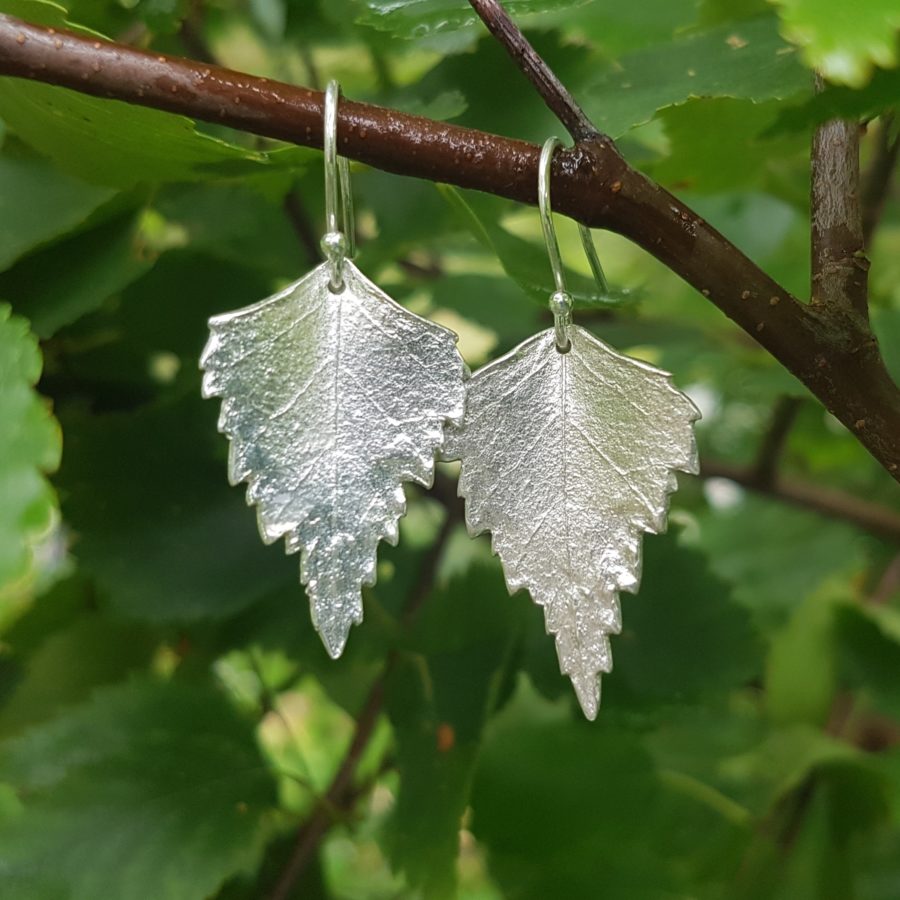 These lovely earrings are made from fine silver birch leaves, they hang from sterling silver ear hooks. In the celtic tree calendar birch is known as the 'Achiever' and symbolises birthdays between December 24th to January 20th. On the back of each leaf is engraved its name and Ogham in the celtic alphabet. These earrings come gift boxed.