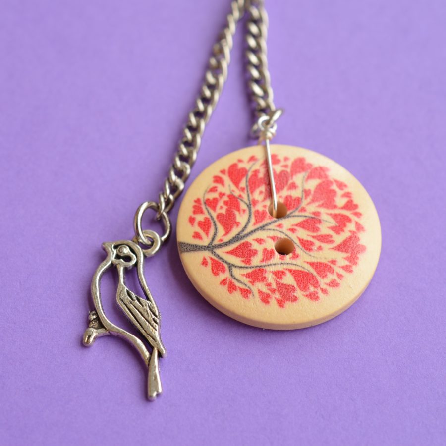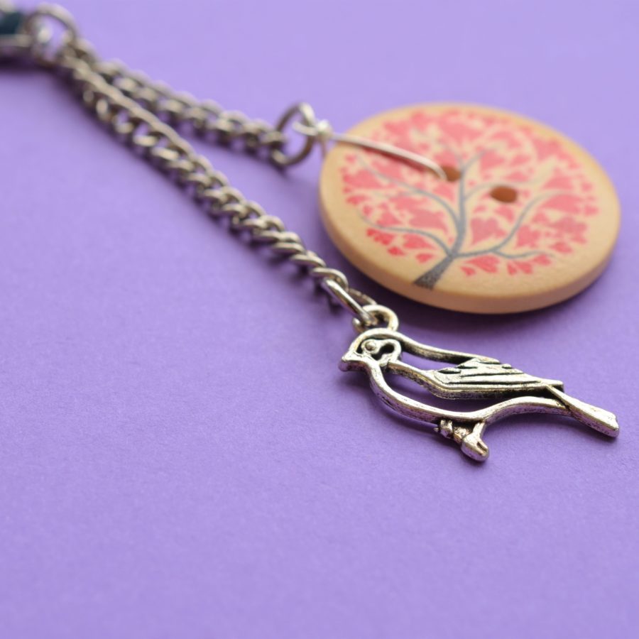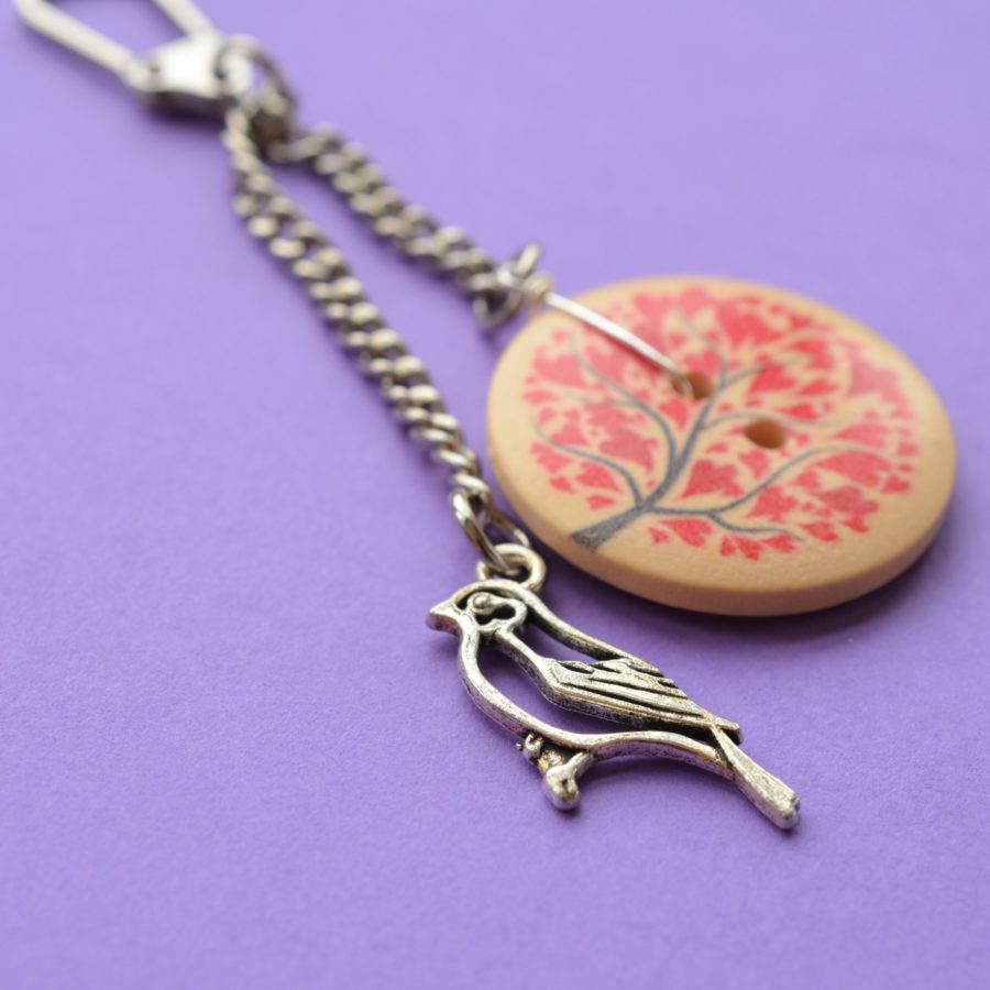 Single button bag charm/keyring with lovely focal red tree button and bird charm. Button approx. 30mm. Full length of bag charm approx. 11cm. Supplied in gift pouch.