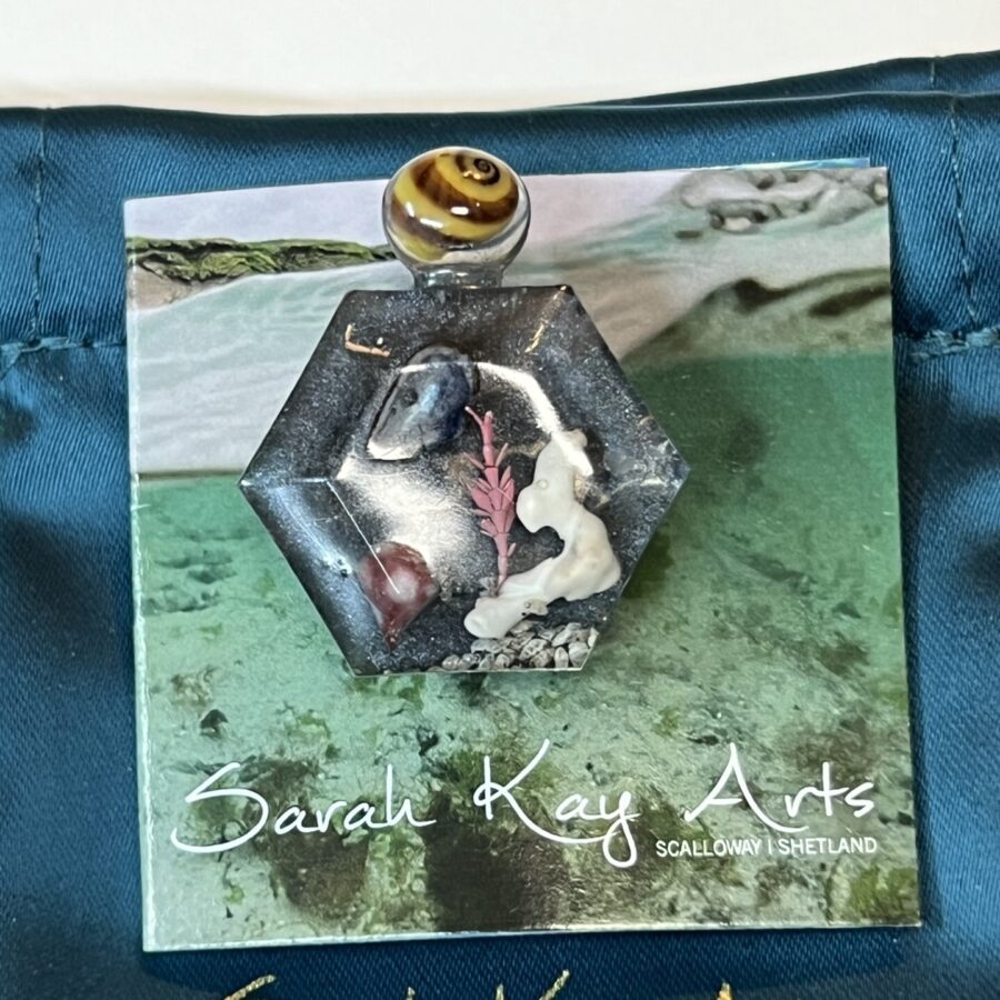 These black beach brooches are made from the tiny shells, seaweed and other treasures Sarah finds on the beaches on Shetland. Each brooch is slightly different and original. The brooches are made with mica powders to colour the background which shimmer in the light.