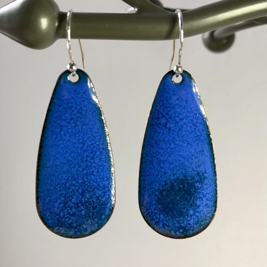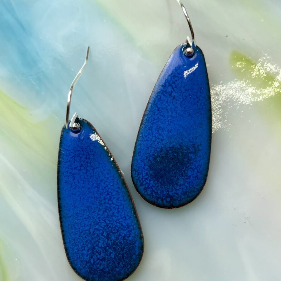 A pretty pair of blue enamelled copper drop earrings with sterling silver ear wires. Counter enamelled on the back.