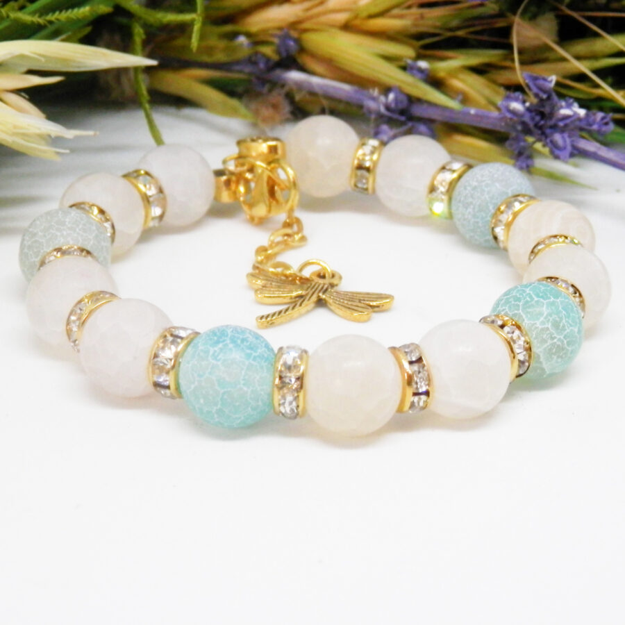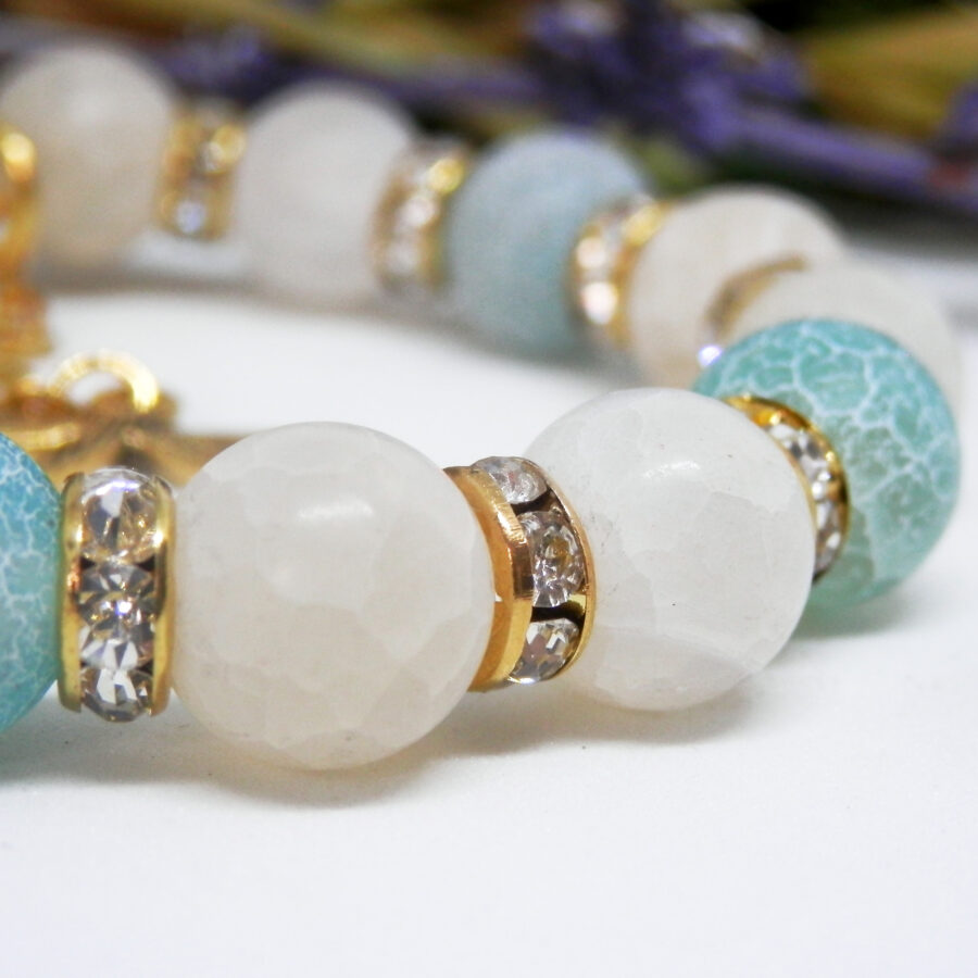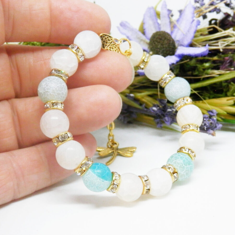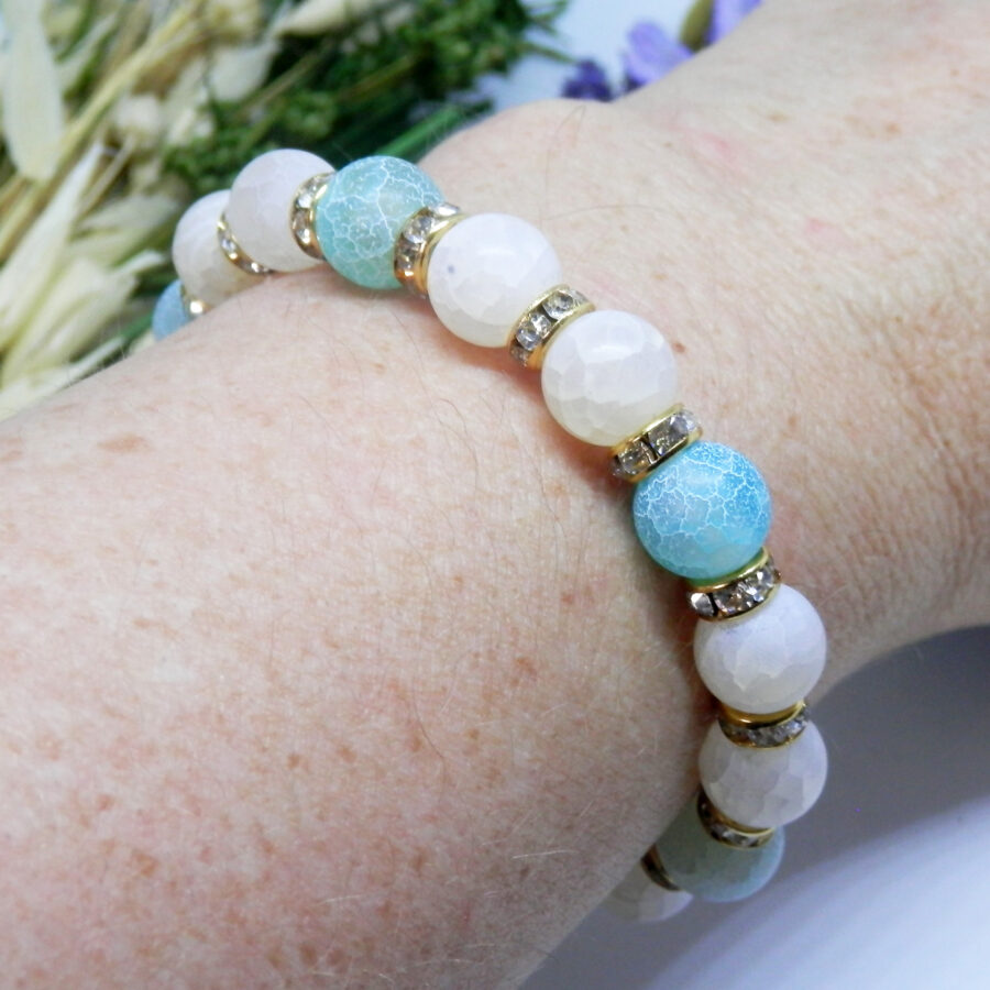 A stunning memory wire bracelet made using gold plated wire, diamante spacers and clasp, with beautiful blue and white dragon's vein agate beads. Nickel and lead free. Would fit up to a 6.5 inch wrist, but has an extension chain for larger sized wrists. Posted in repurposed envelopes or boxes – trying to do my tiny bit for the environment by reusing my postage wrappings.