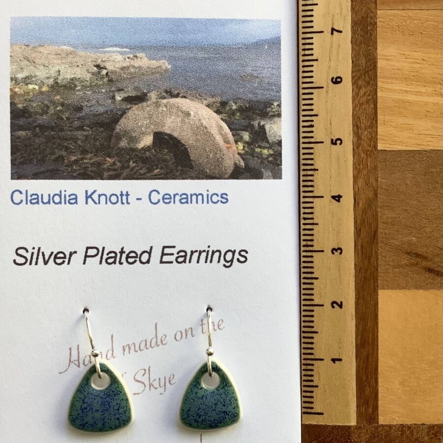 A pair of tiny triangular ceramic earrings with silver plated ear hooks. The earrings are made of white stoneware clay with a Blue Lagoon glaze. These earrings are individually handcrafted with slight variations of glaze, pattern and design.