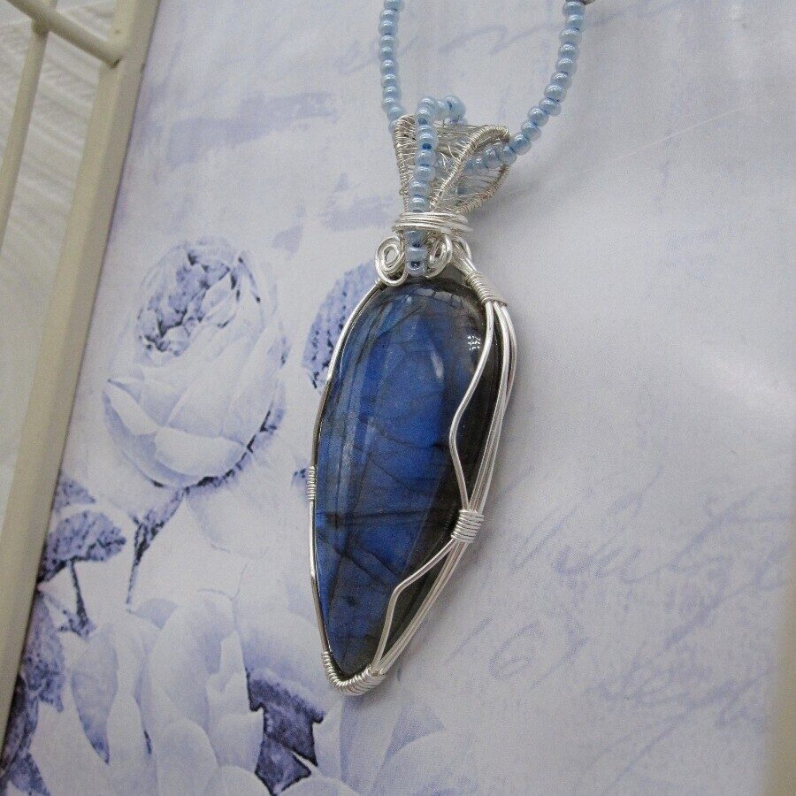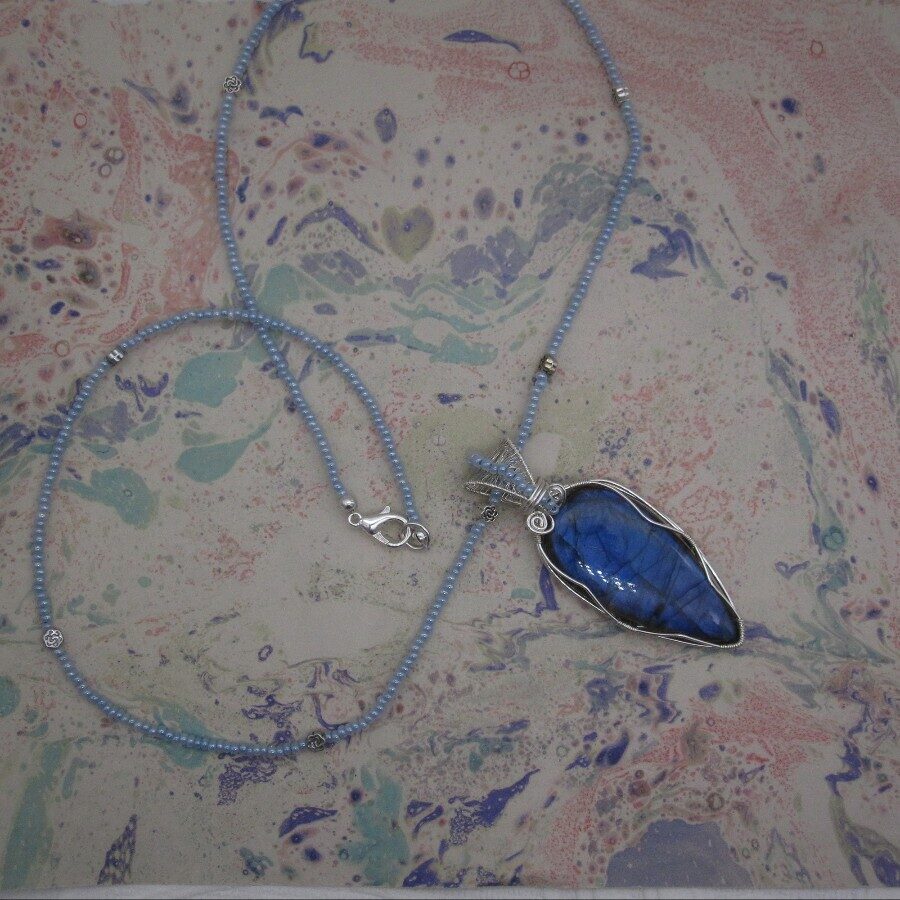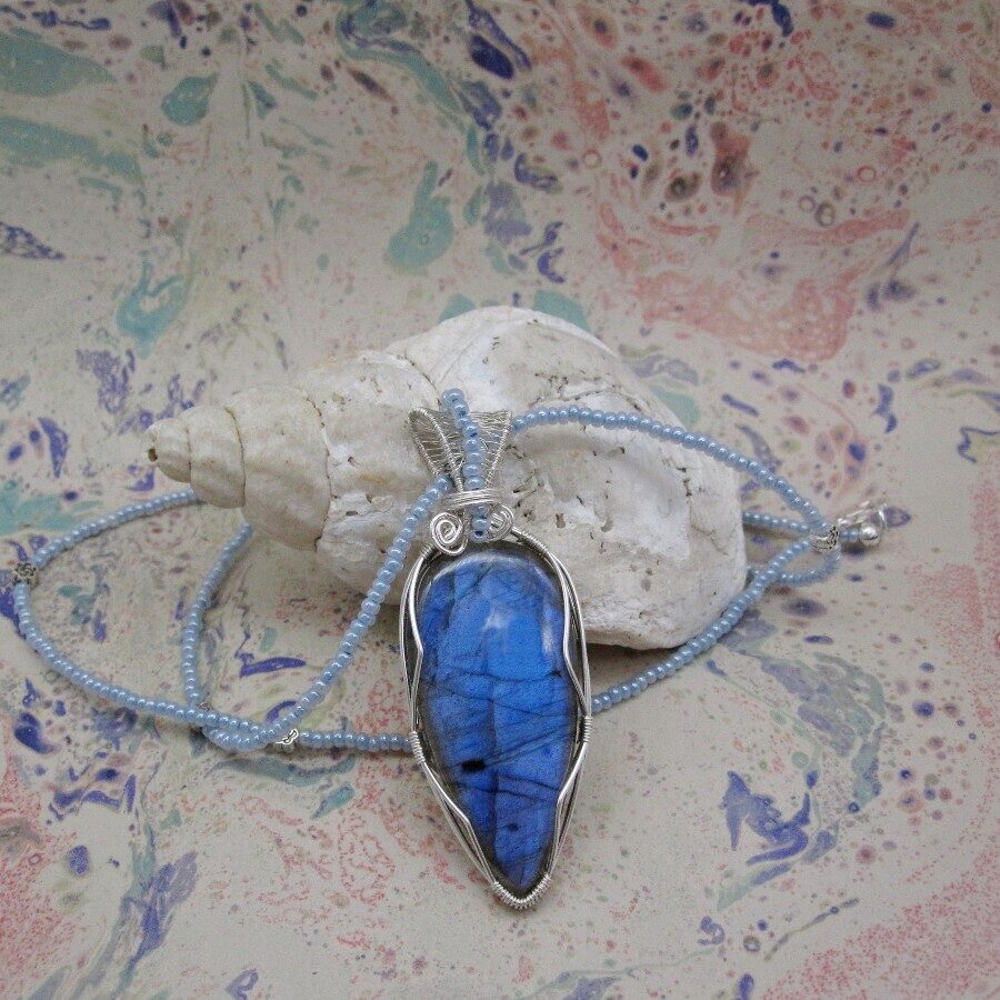 This ‘one of a kind’ pendant was inspired by walks on the shore in Skye, watching storm tossed seas. It would make a great gift for seashore wanderers, rockpool explorers… or mermaids! It features blue sheen labradorite with a silver-plated wire wrap and is finished with tiny pastel blue seed beads.