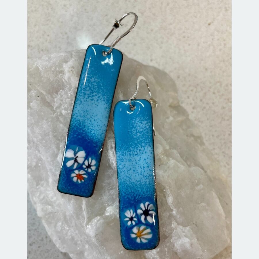 A pretty pair of blue enamelled copper earrings with flowers on sterling silver ear wires. Counter enamelled on the back.
