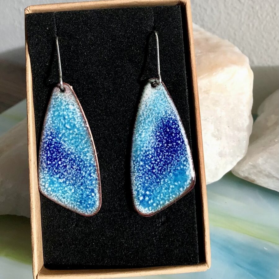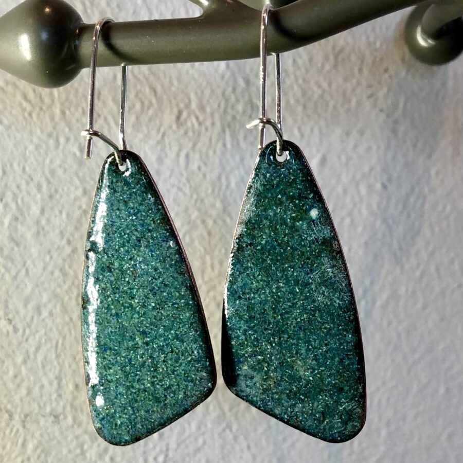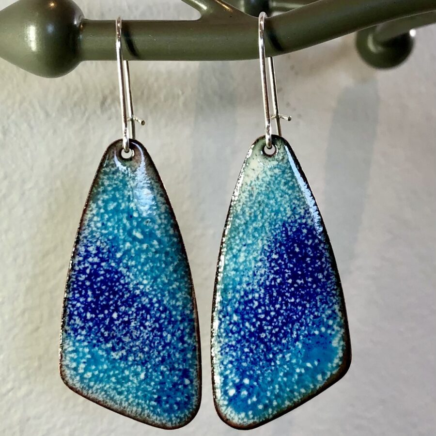 A pretty pair of enamelled copper earrings with sterling silver ear wires. Counter enamelled on the back.