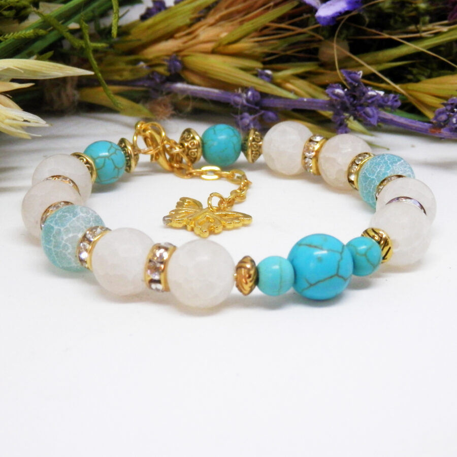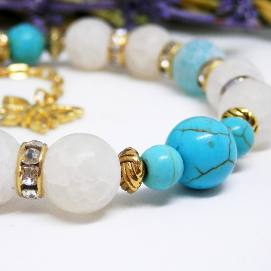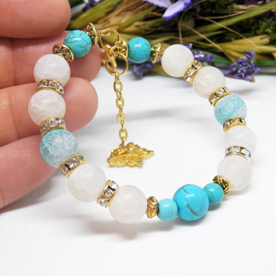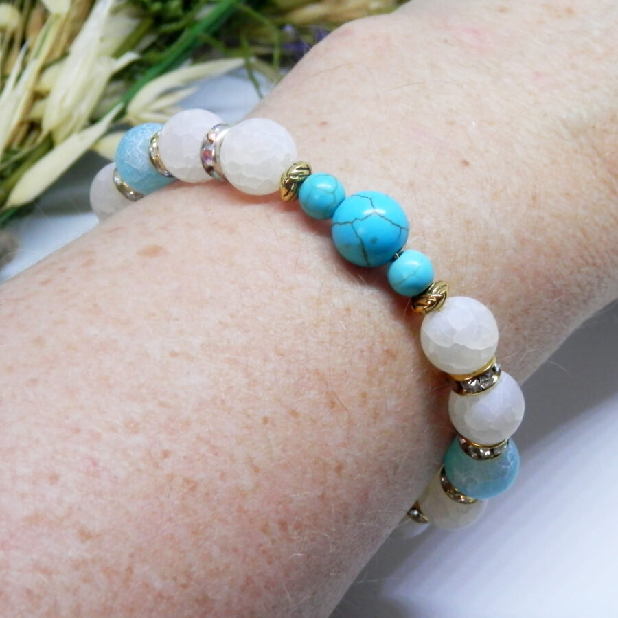 A gorgeous memory wire bracelet made using gold plated wire, diamante spacers and clasp, with fabulous blue and white dragon's vein agate beads and blue howlite beads. Nickel and lead Free. Would fit up to a 6.5 inch wrist, but has an extension chain for larger sized wrists. Posted in repurposed envelopes or boxes – trying to do my tiny bit for the environment by reusing my postage wrappings.