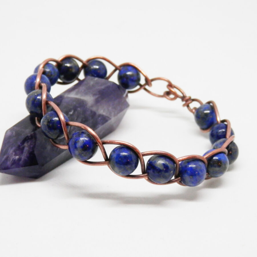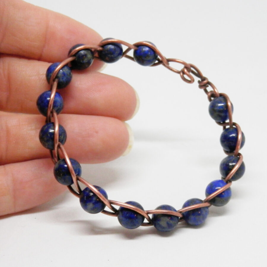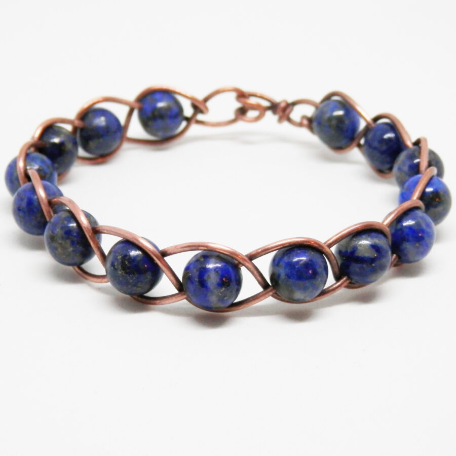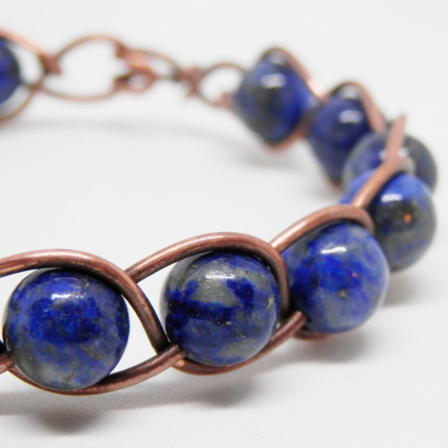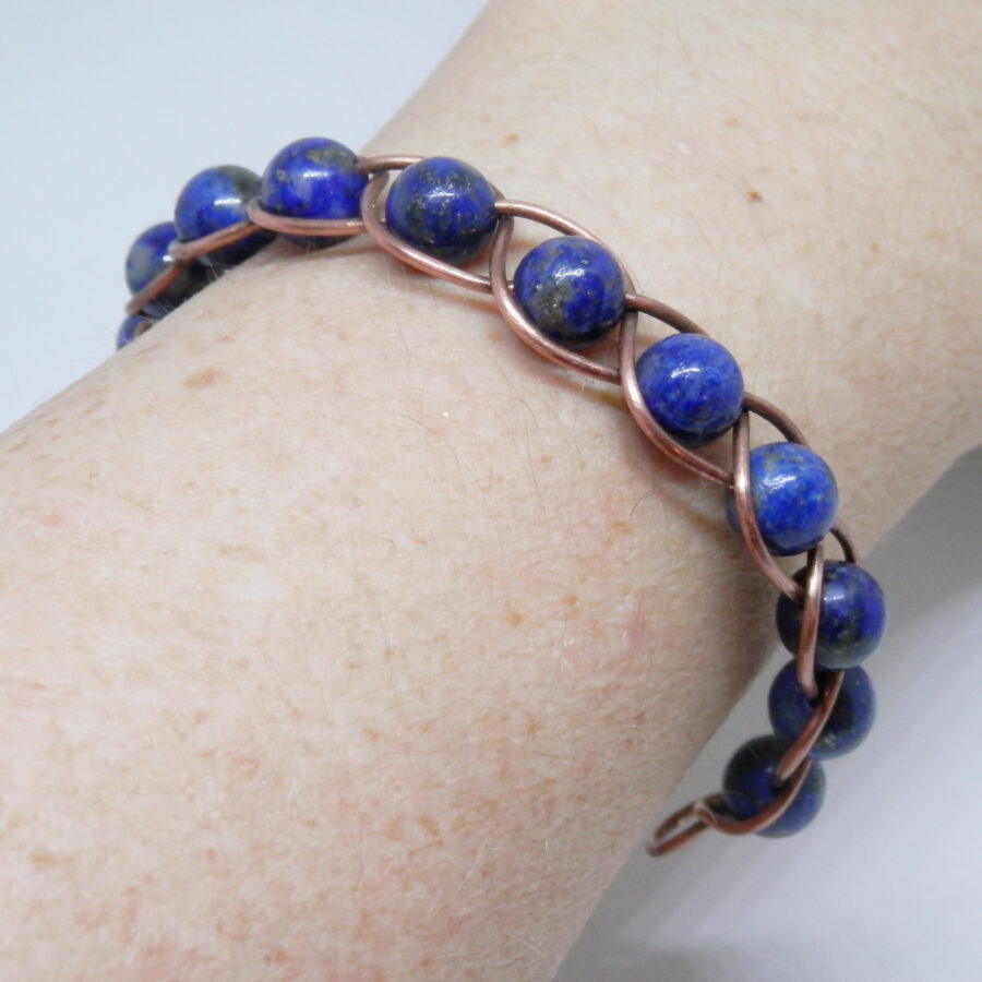 A beautiful handmade bracelet with lots of 8 mm lapis lazuli beads, threaded onto antiqued copper wire and woven into a simple Celtic braid pattern. It will fit up to a 7 inch wrist and fastens with a matching clasp. It comes to you in a black gift box with padded insert. Lead and nickel free