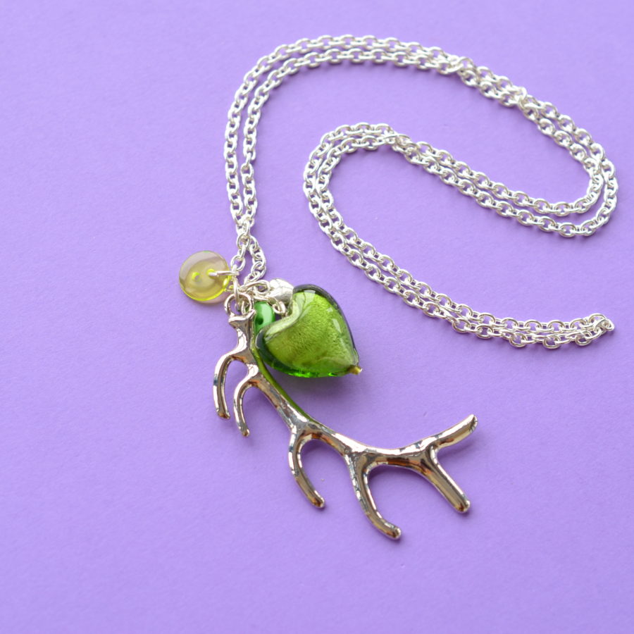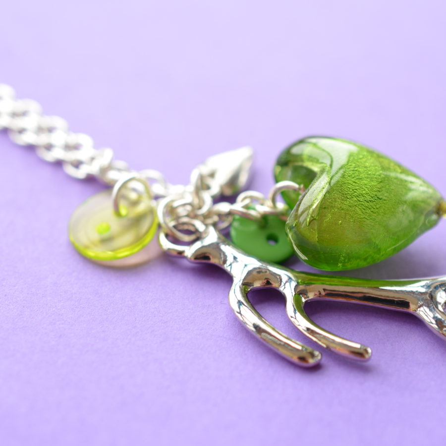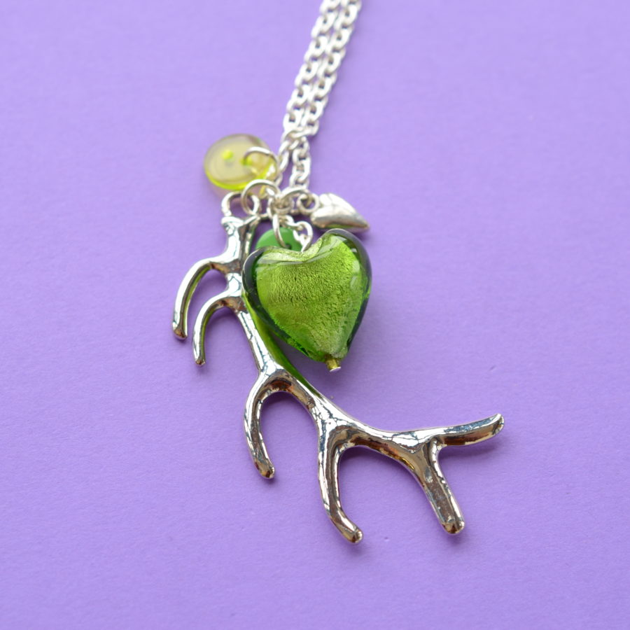 This long cluster pendant with silver antler, bright green glass heart, green buttons, and heart charms on a 27-inch chain. The necklace is made with silver-plated findings. The pendant approx. 3-inch long and is supplied in a gift pouch.