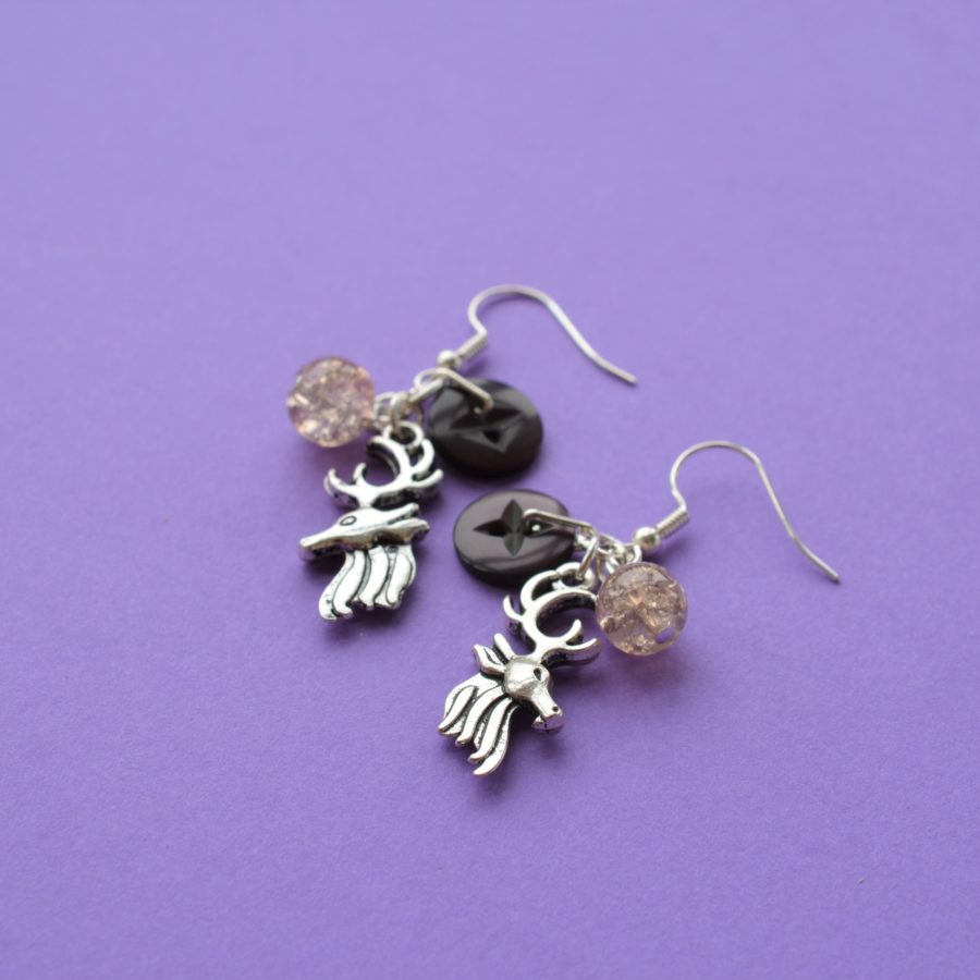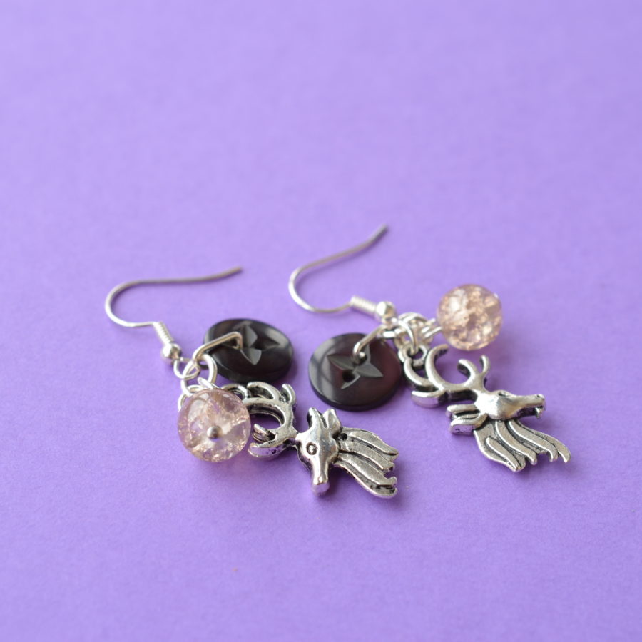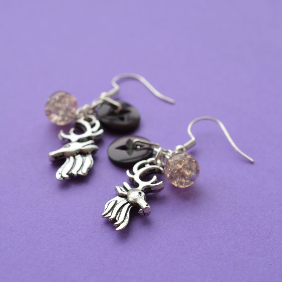 Cluster earrings made with a button, a bead, and a stag charm. The ear findings are sterling silver the other findings are silver-plated. The full length of earring from top of the hook is approx. 5cm and is supplied in a gift pouch.