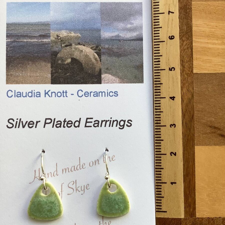A pair of tiny triangular ceramic earrings with silver plated ear hooks. The earrings are made of white stoneware clay with a Cactus glaze. These earrings are individually handcrafted with slight variations of glaze, pattern and design.