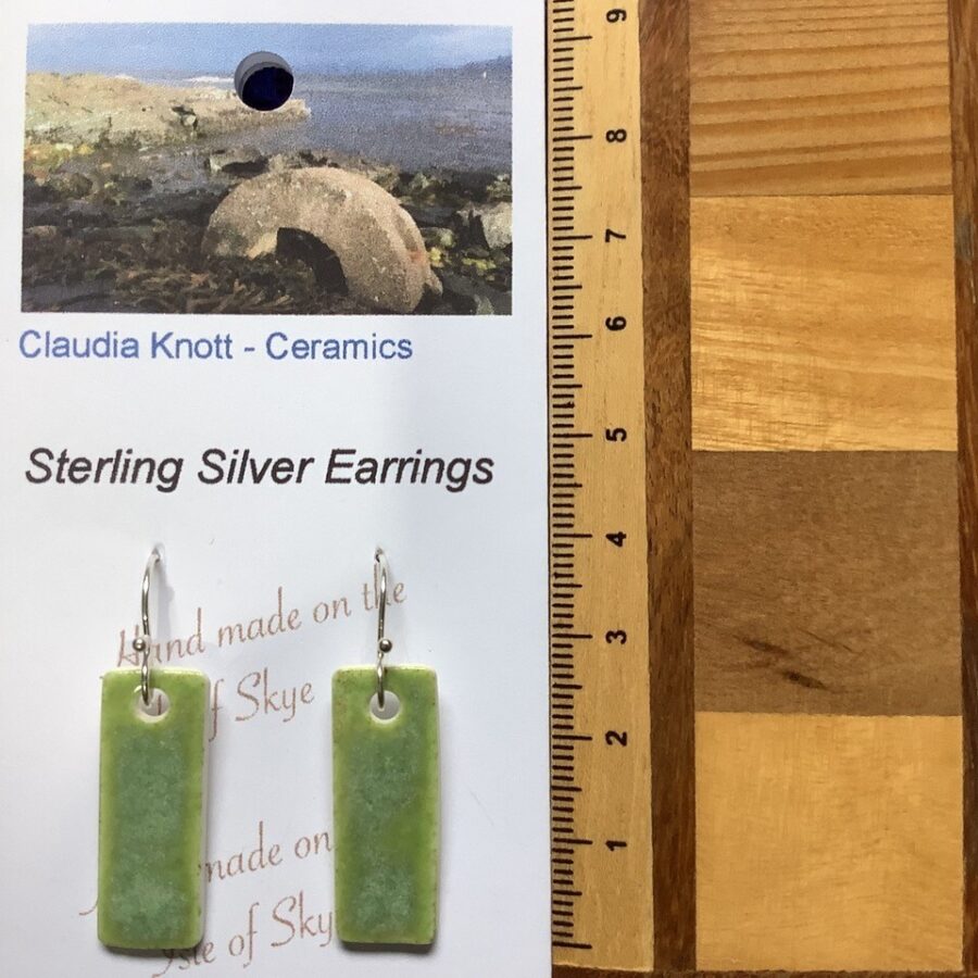 A pair of small rectangular ceramic earrings with sterling silver ear hooks. The earrings are made of white stoneware clay with a cactus green glaze. These earrings are individually handcrafted with slight variations of glaze, pattern and design.
