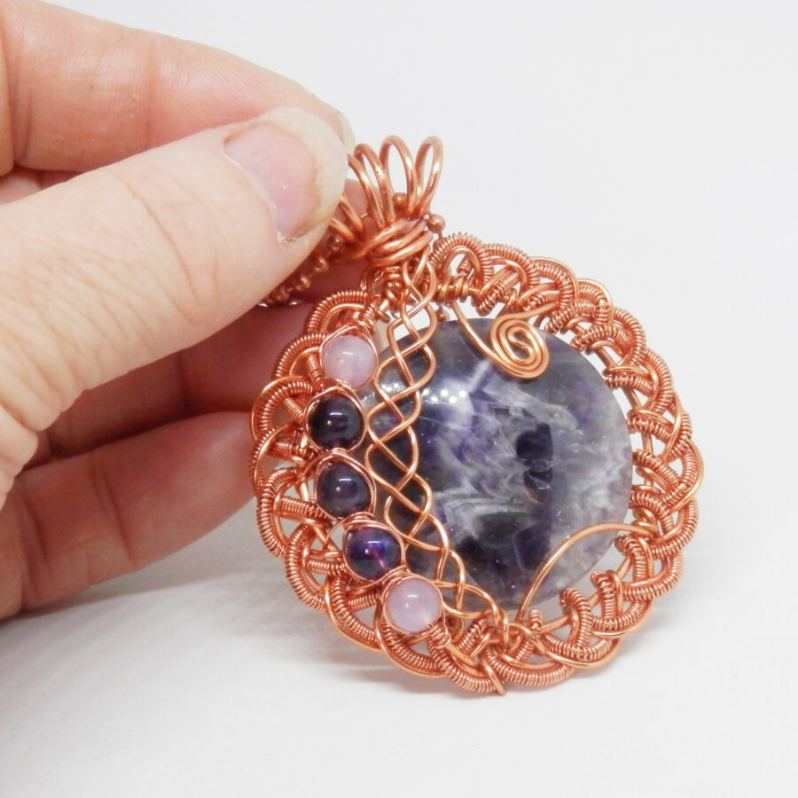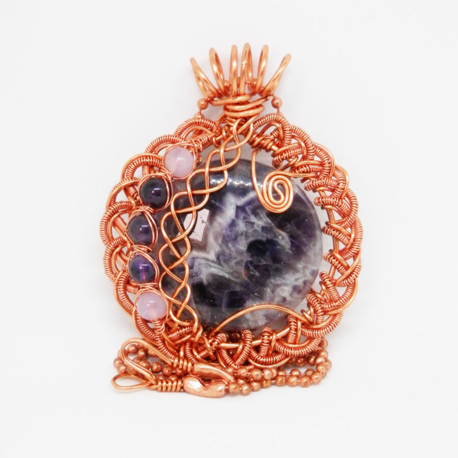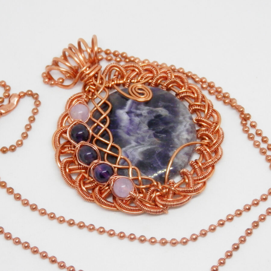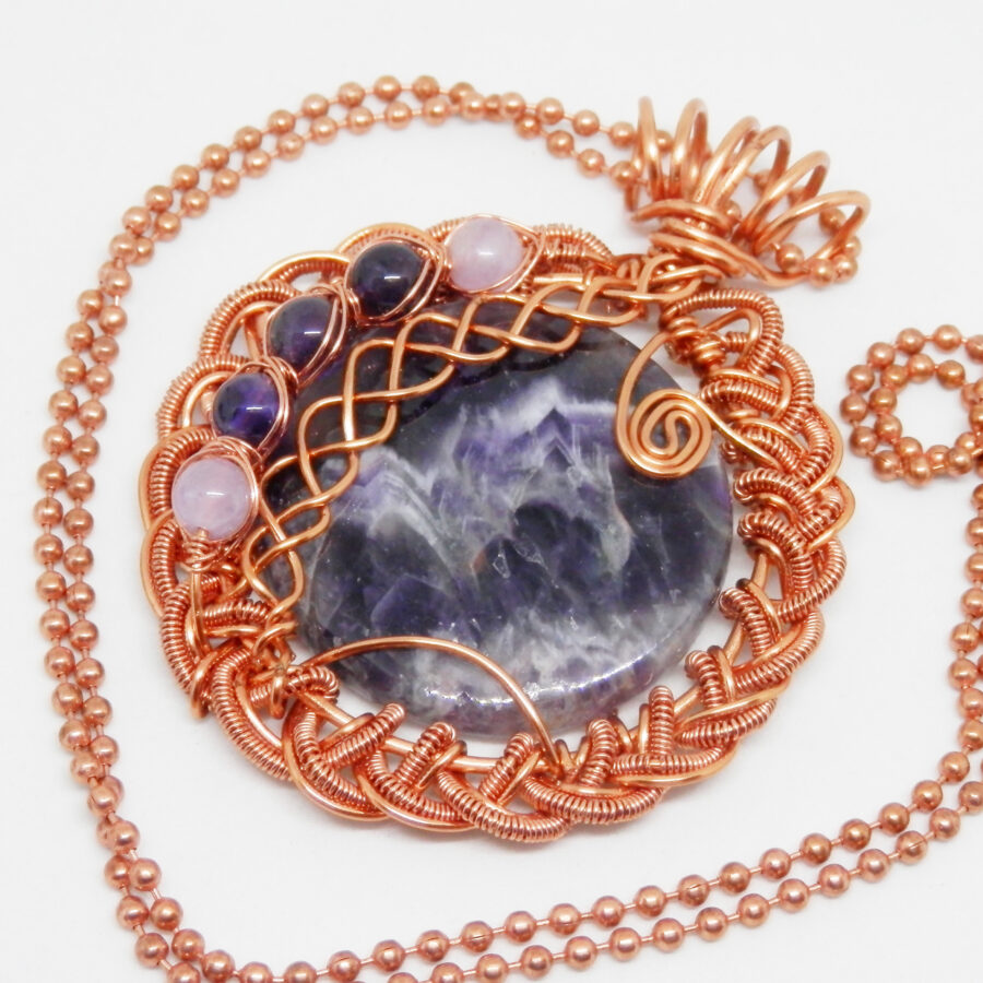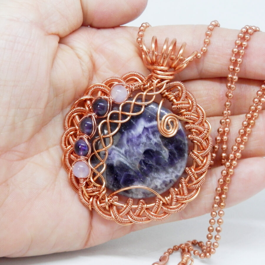 A stunning necklace made with a fabulous chevvron amethyst cabochon wrapped in tarnish resistant copper wire with lots of Celtic braiding and amethyst beads. The pendant is around 6.8 cm long by 5.5 cm wide and 1.2 cm thick at the deepest point. It comes with a 24 inch ball chain with handmade hook and eye clasp. Lead and nickel free. This wire wrapped pendant will come to you placed in a soft velvet pouch.