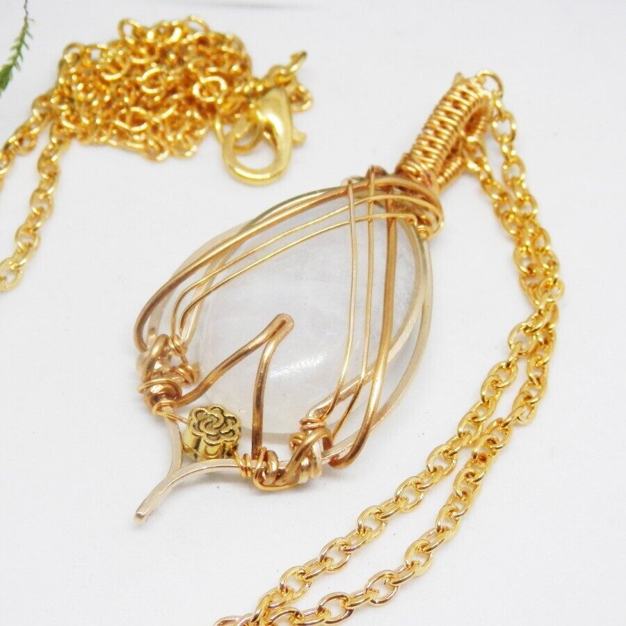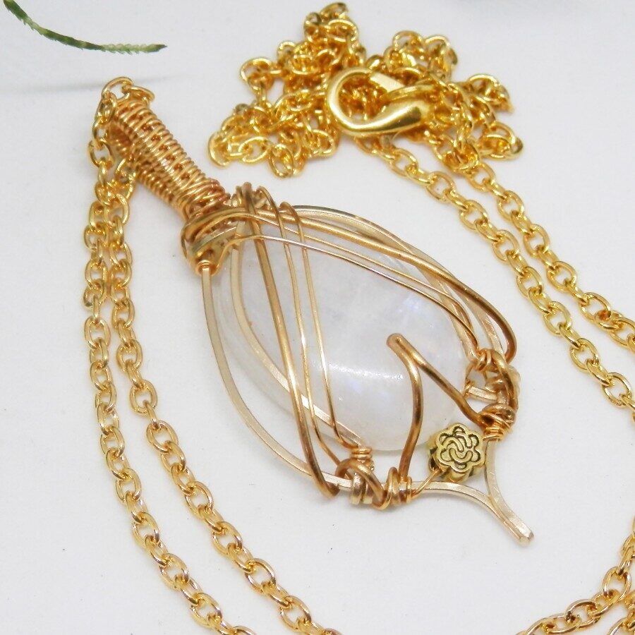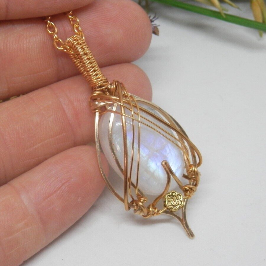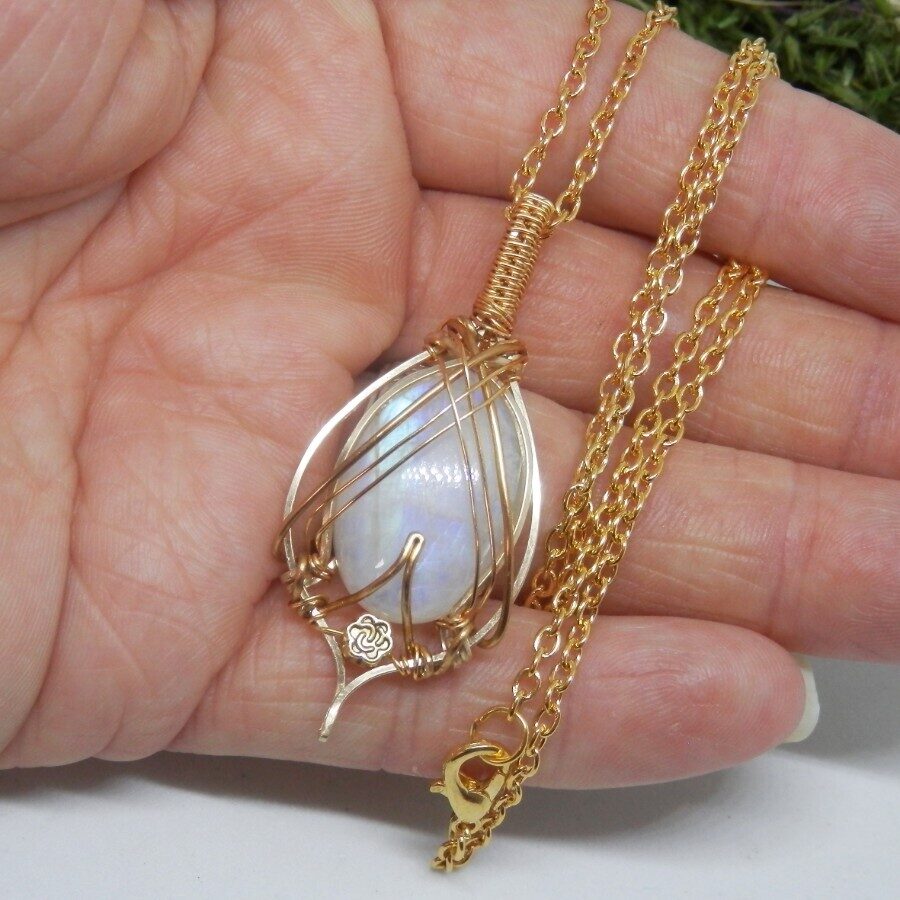 This fabulous gold filled wire necklace features a gorgeous rainbow moonstone cabochon wrapped in an elegant Celtic style. Nickle and Lead Free. Comes with a 24 inch gold plated chain which can be shortened if required, just ask when ordering! Comes to you wrapped in tissue, no plastic. Posted in repurposed envelopes or boxes – as the maker is trying to do her tiny bit for the environment by reusing her postage wrappings.