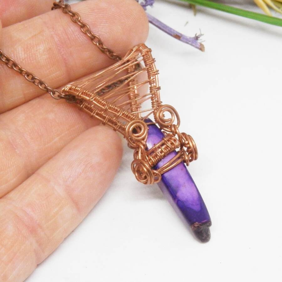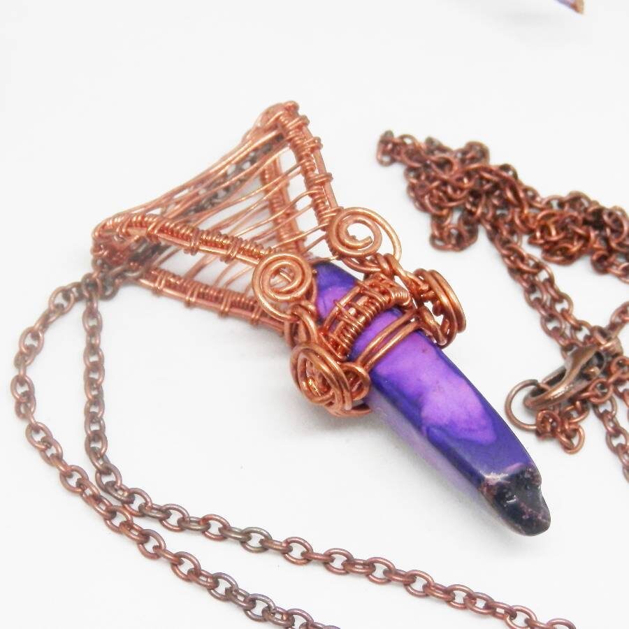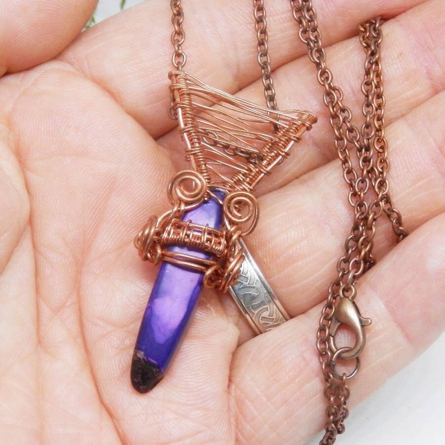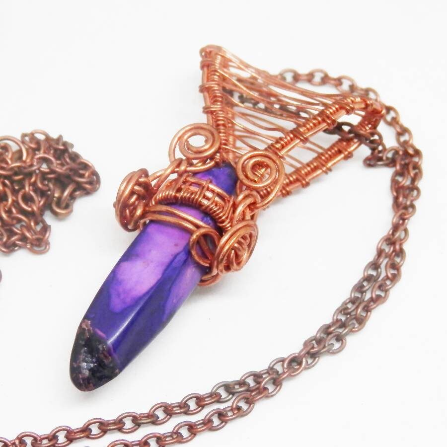 This is a gorgeous Celtic style wire wrapped necklace with a stunning big bail is made with bare copper wire wrapped around a lovely purple jasper point, with little Celtic swirl focal points. The pendant is approx 5 cm long by 2.5 cm wide and 1.5 cm thick at the deepest point. It comes with a 22 inch copper chain with lobster clasp. Lead and nickel free.