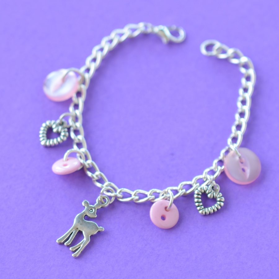 Cute children’s button charm bracelet with buttons and sweet deer and heart charms. 17 cm silver-plated chain which can be joined at any point for different sized wrists. Made with silver-plated findings. Supplied in a gift pouch.