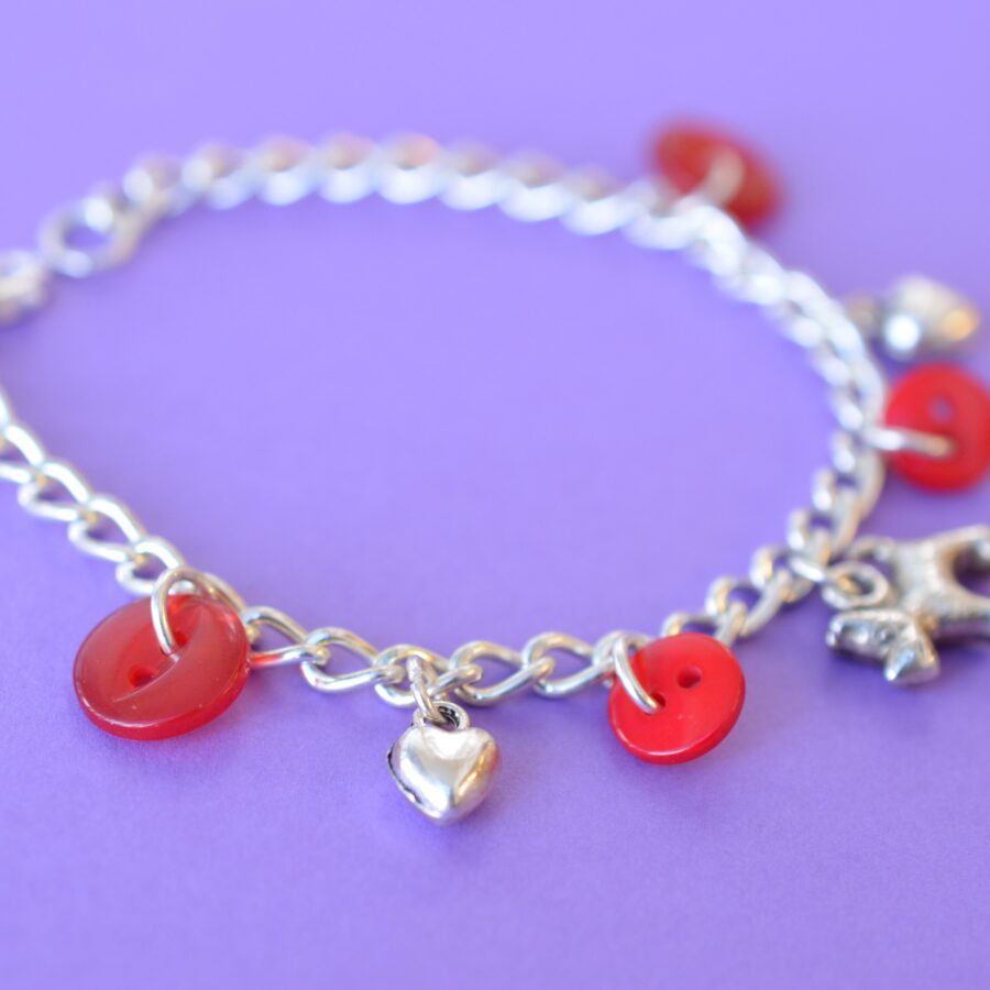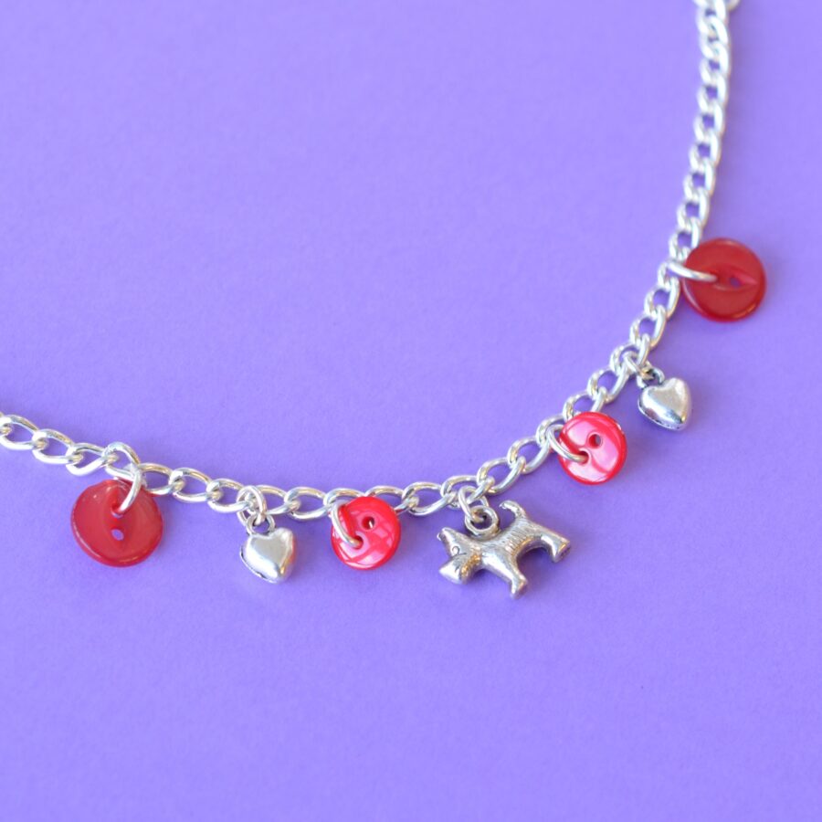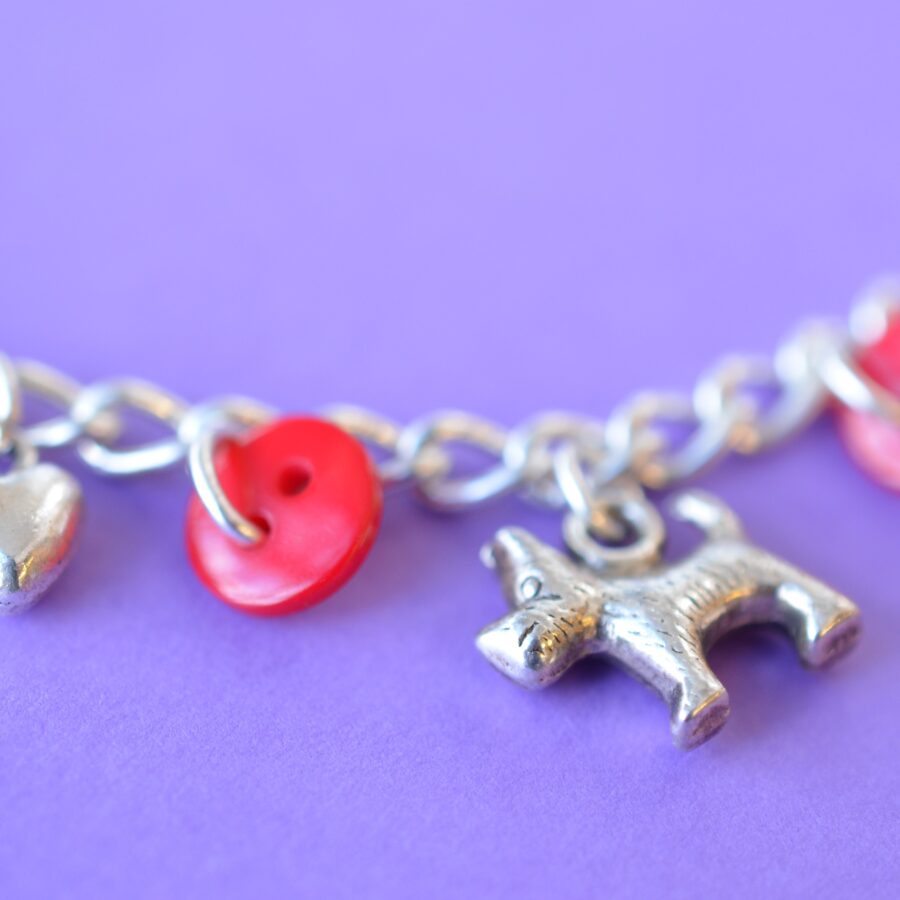 Cute children’s button charm bracelet with buttons and cute scotty dog and heart charms. 17 cm silver-plated chain which can be joined at any point for different sized wrists. Made with silver-plated findings. Supplied in a gift pouch.