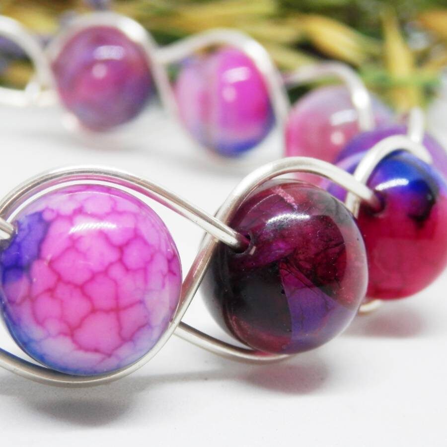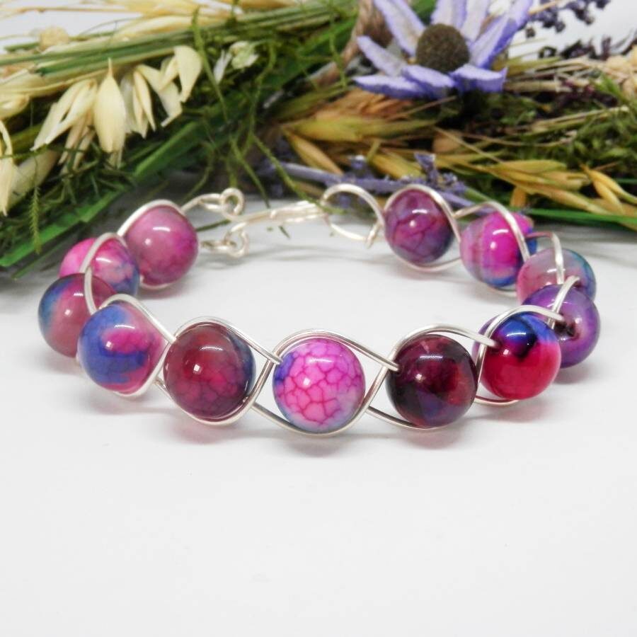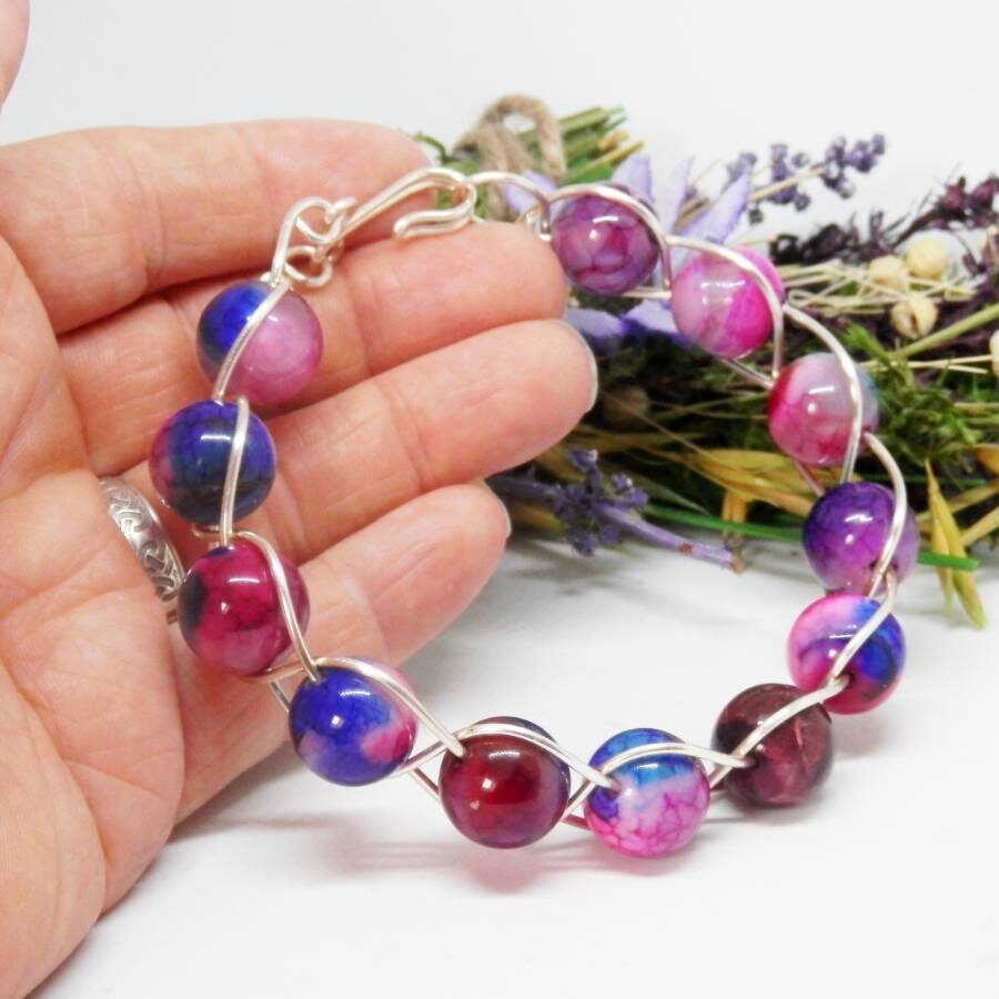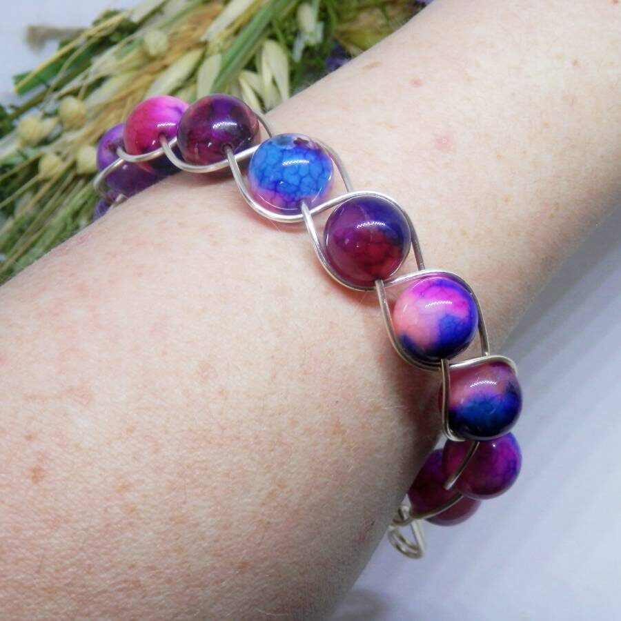 A large sized chunky Celtic weave bracelet made using silver plated wire, and some lovely big dragon's vein agate beads in hot pink/red and blue colours. Fits up to an 8 inch wrist. Comes to you wrapped in tissue, no plastic. Posted in repurposed envelopes or boxes as the maker is trying to do her tiny bit for the environment by reusing my postage wrappings.