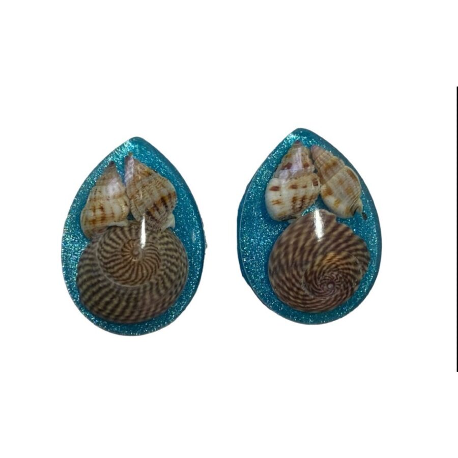 This design has 1 silver top shell with 2 tiny dog whelk shells. In a choice of black or turquoise background. Both are finished with a sterling silver post and butterfly back. They come in a small gift box