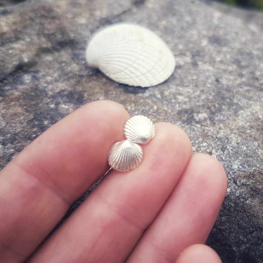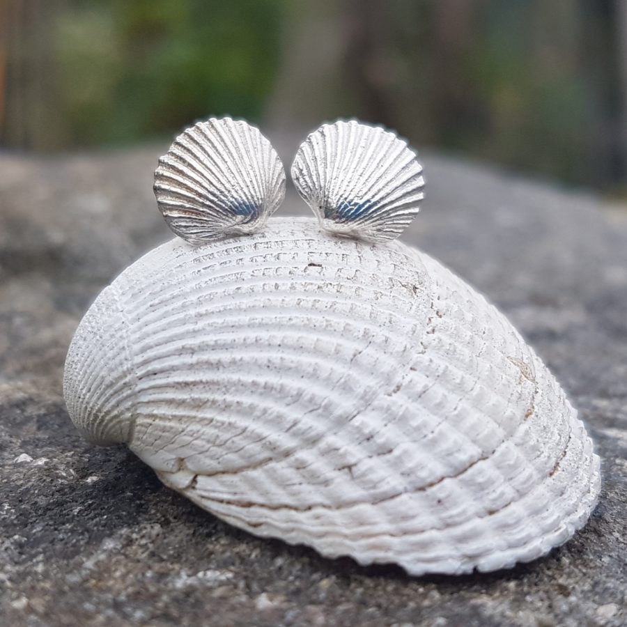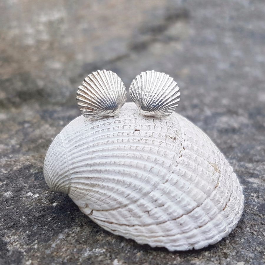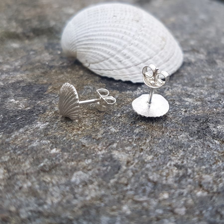 These cute studs are made from tiny cockle shells cast into solid fine silver, the ear posts and scrolls are sterling silver, they will come gift boxed.