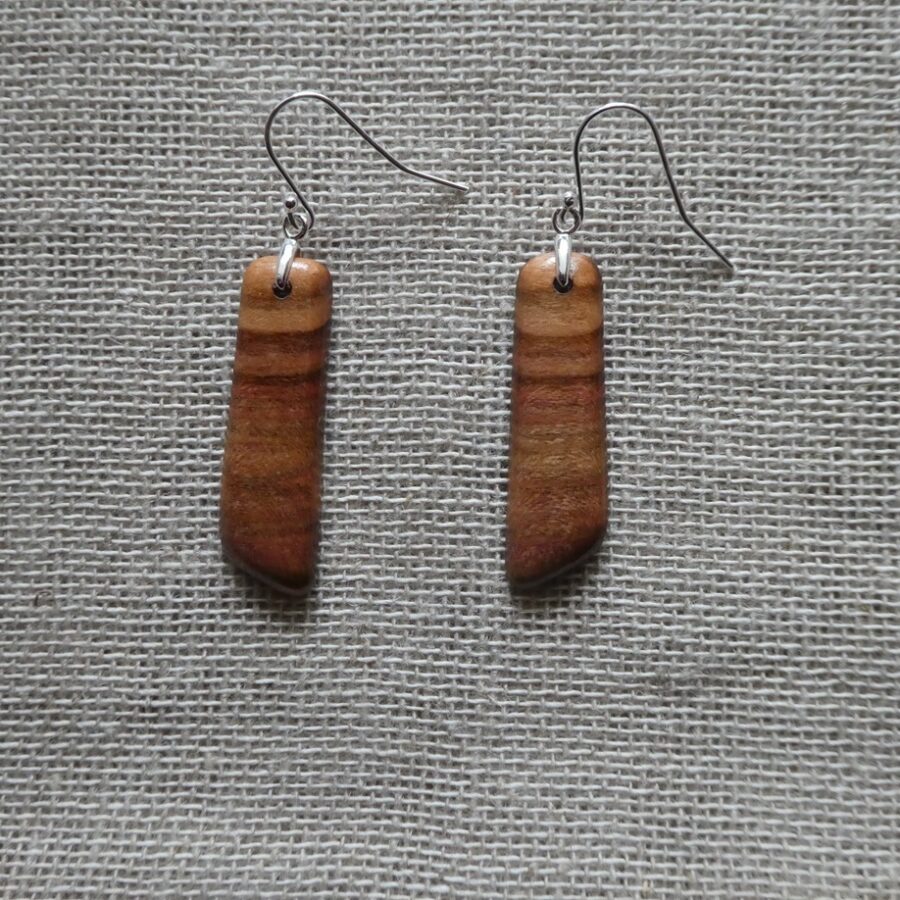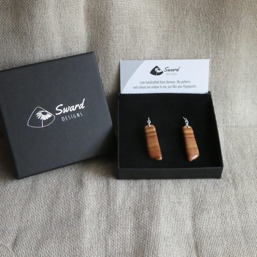 A unique pair of damson wood straight-sided drop earrings with sterling silver findings.