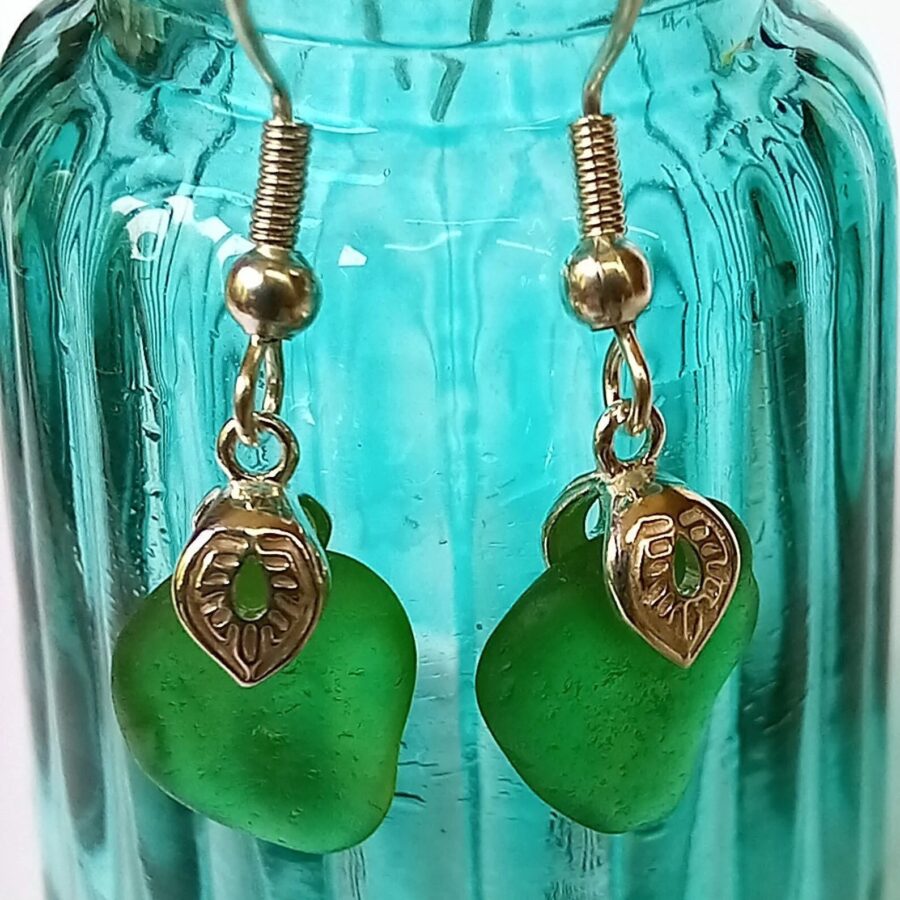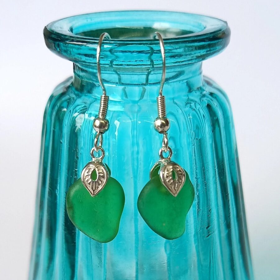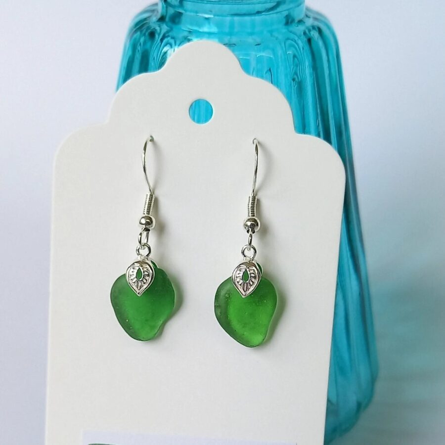 These earrings feature beautiful locally found pieces of genuine sea glass in green. The maker carefully drills a small hole in the sea glass to attach to a sterling silver bail that hangs beautifully from the sterling silver ear wire. Total length of the earring is approx 4 cm.