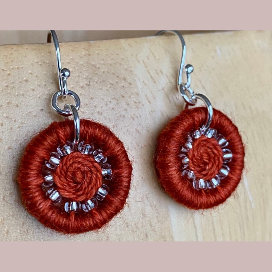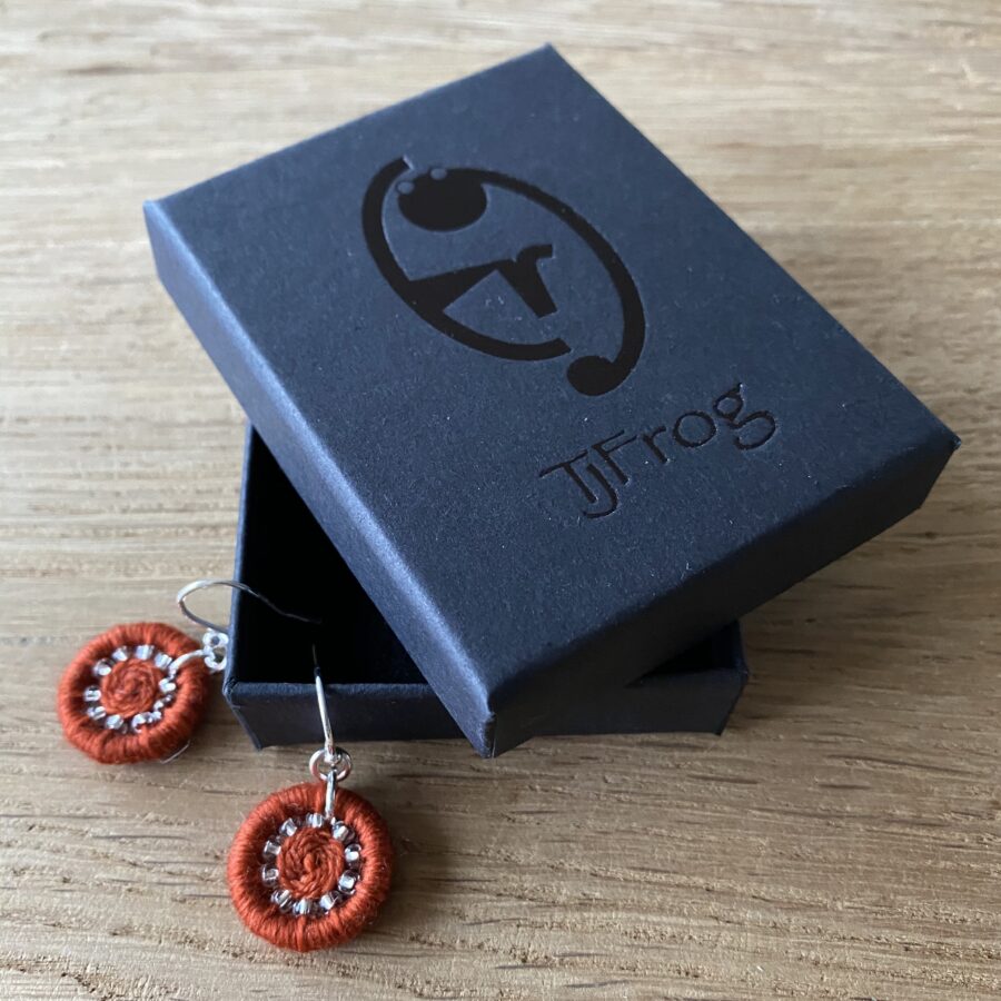 Beautiful earrings made using techniques of the heritage craft of Dorset Buttons. Yarn hand dyed in the Scottish Highlands combined with clear beads and finished off with sterling silver findings. All wrapped up in a TJFrog gift box made from recycled card and paper.