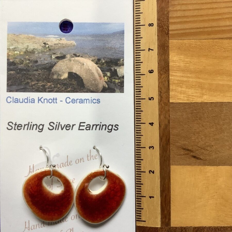 A pair of ‘Mary Quant’ style ceramic earrings with sterling silver ear hooks. The earrings are made of white stoneware clay with a deep red ember glaze. These earrings are individually handcrafted with slight variations of glaze, pattern and design.